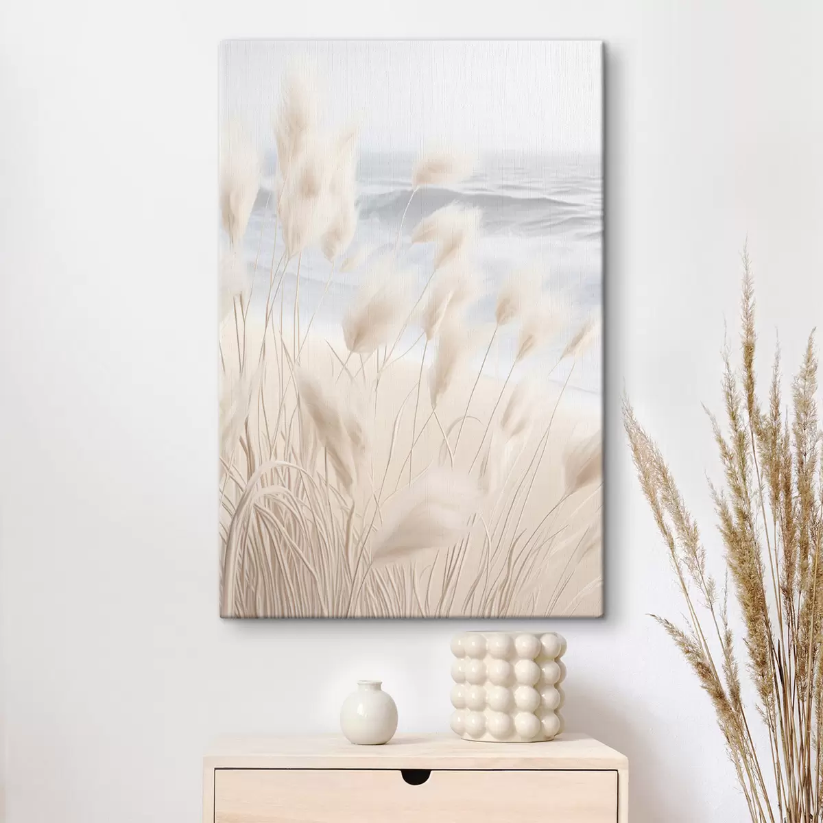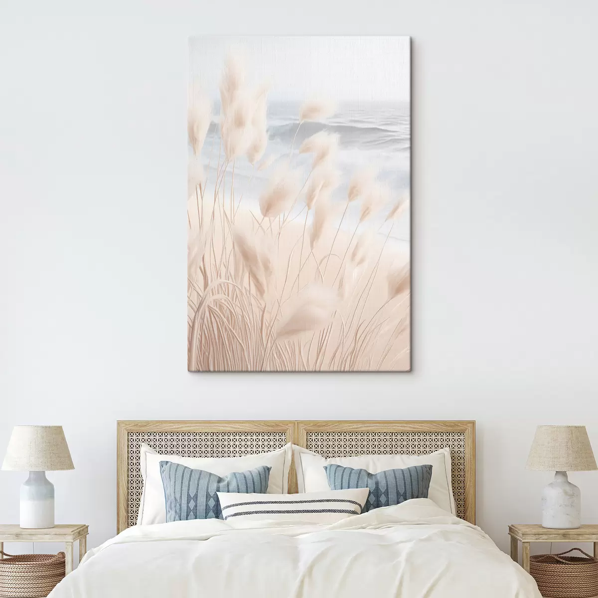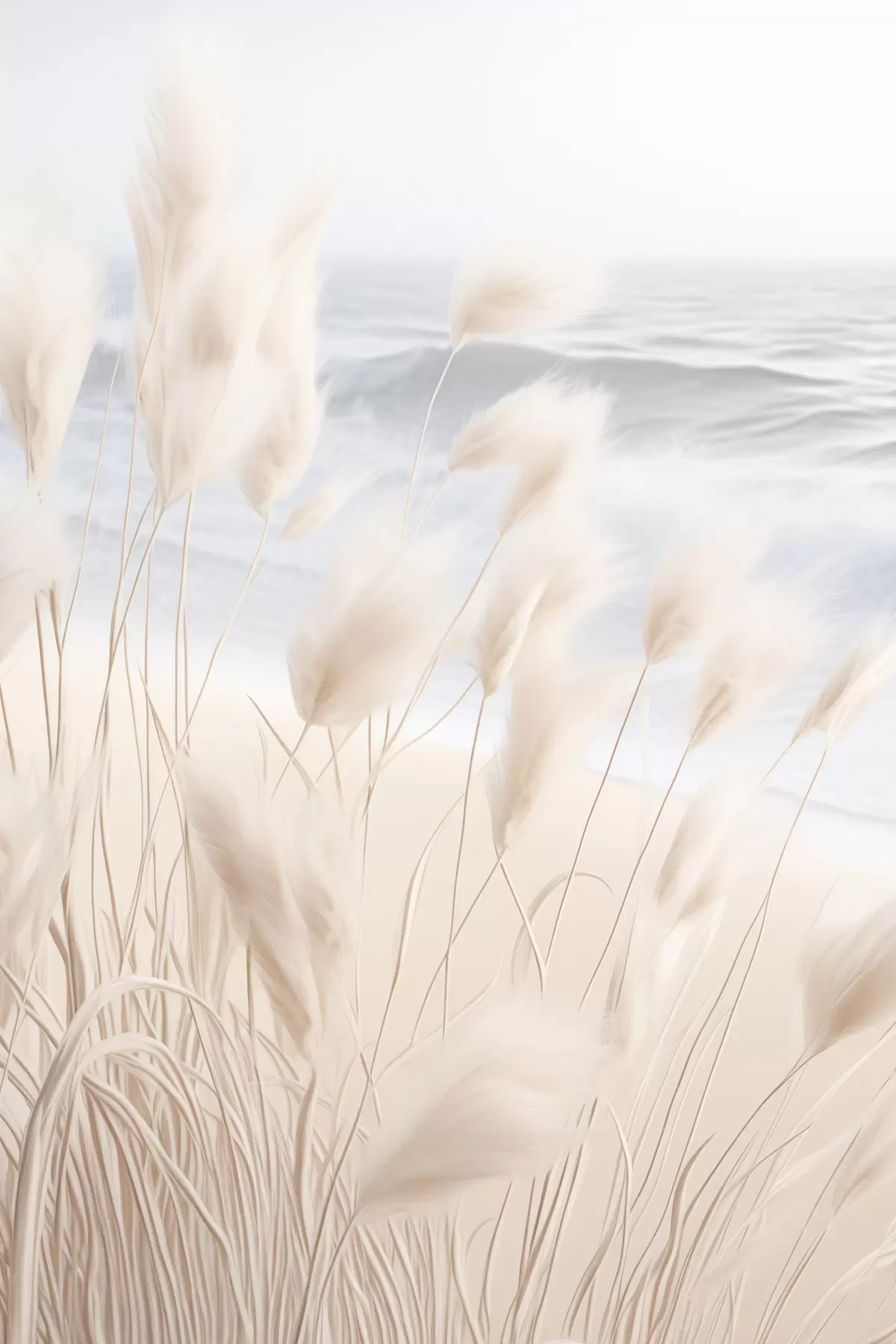 Paveikslas Aukšta, plunksniška pampų žolė švelnių smėlio atspalvių pirmame plane, o fone – smėlio paplūdimys. Nr s47432