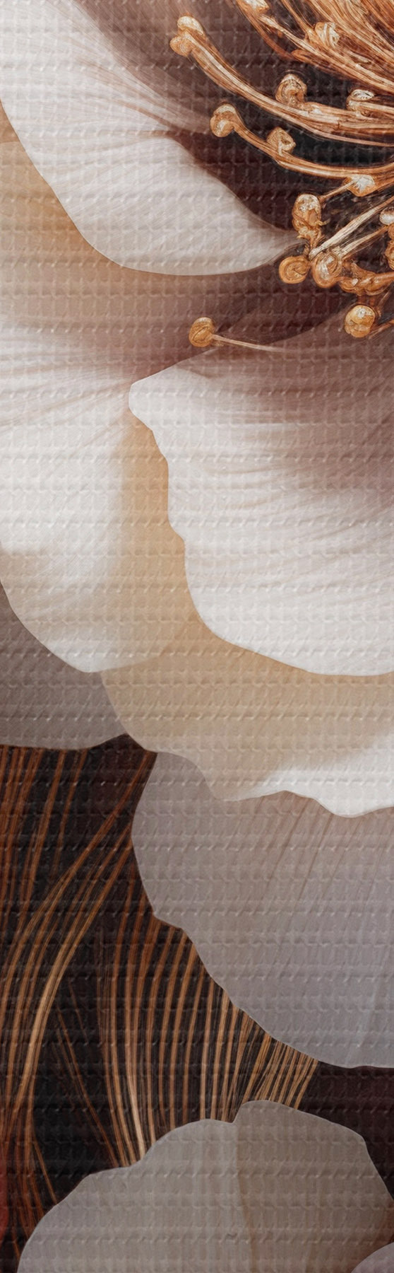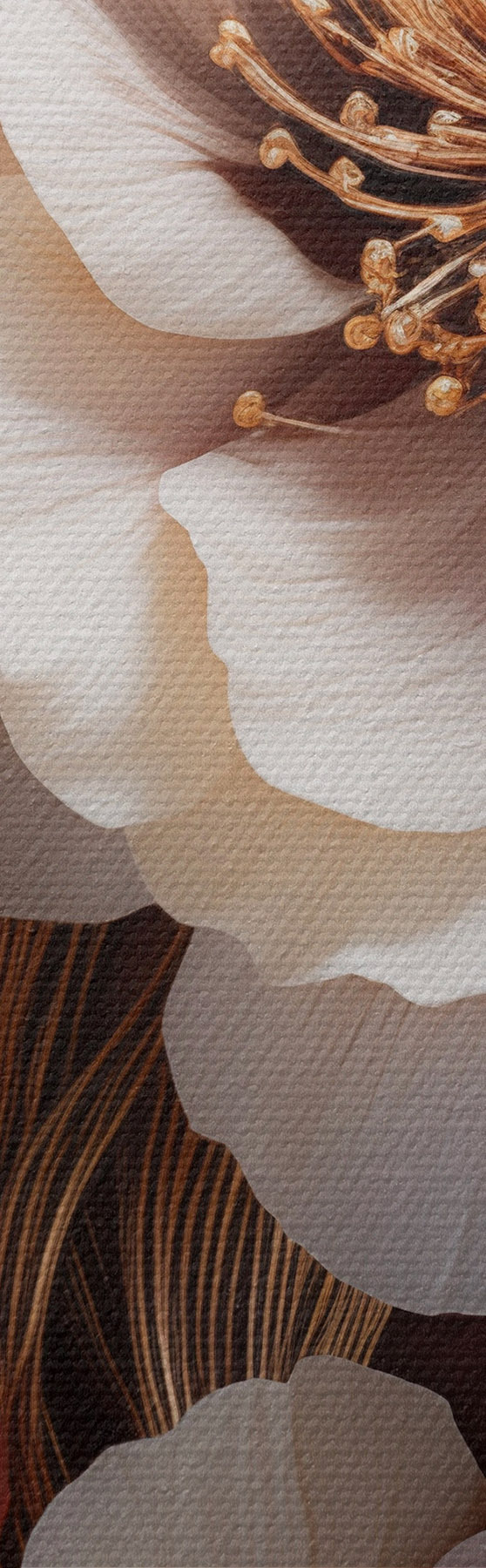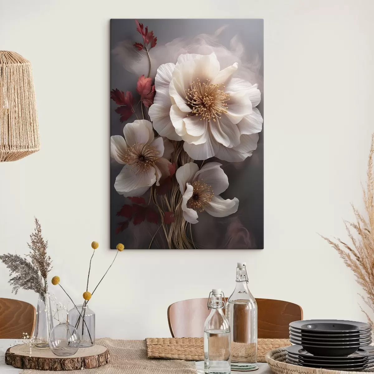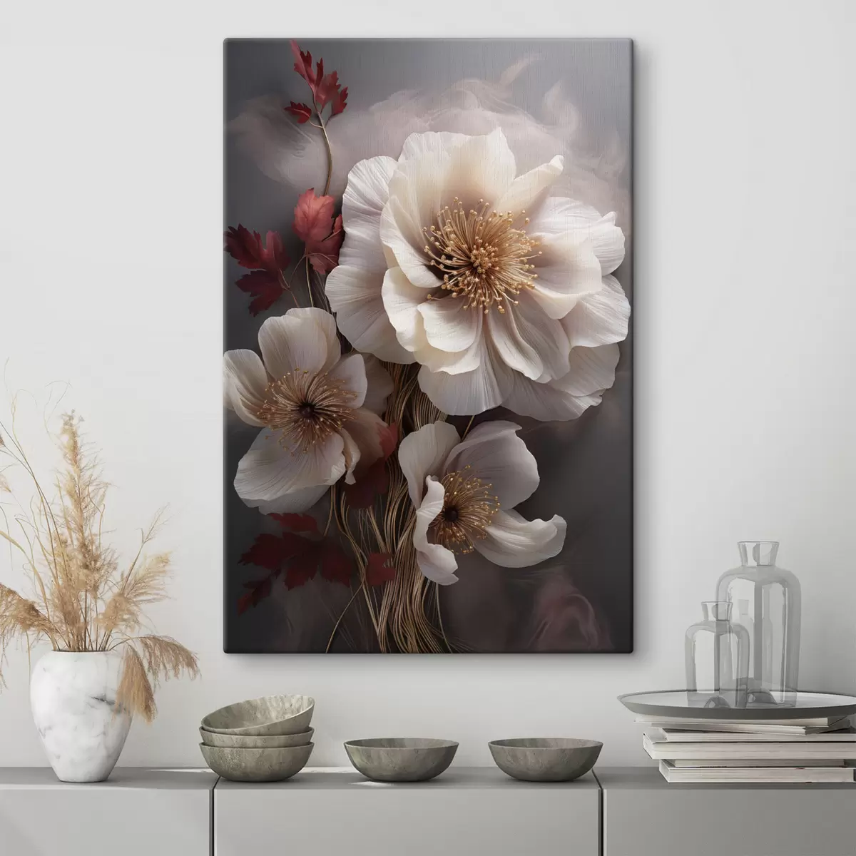 Paveikslas Subtilūs bijūnai su plonais, plaušėtais žiedlapiais, apsupti tamsiai raudonais lapais ant abstraktaus fono Nr s47434