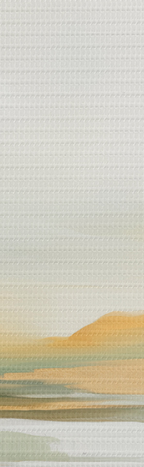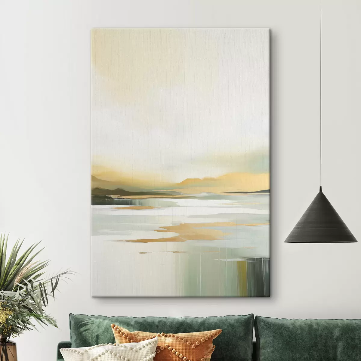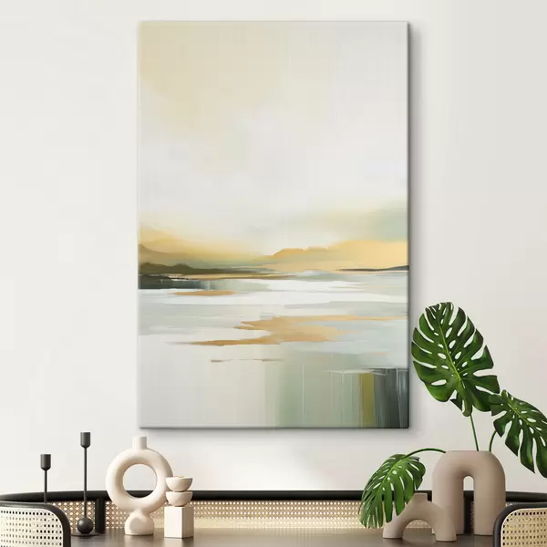 Paveikslas Abstraktus peizažas su geltonais ir žaliais atspalviais, vanduo, atspindintis dangų ir tolimus kalnus, blyškus, miglotas dangus Nr s47439