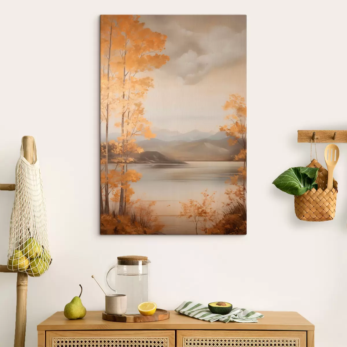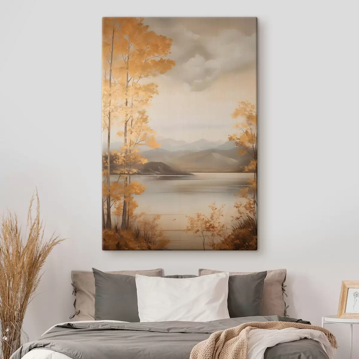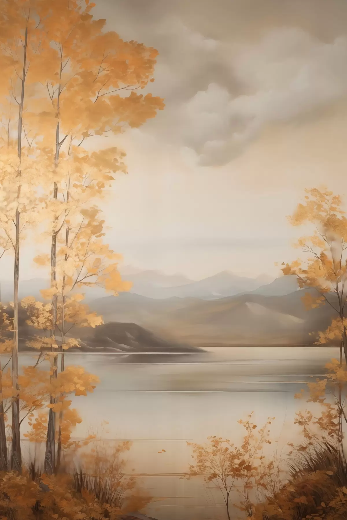 Paveikslas Rudens tekstūruoti medžiai su oranžiniais lapais apjuosia ramią ežerą su tolimais kalnais po debesuotu dangumi. Nr s47441