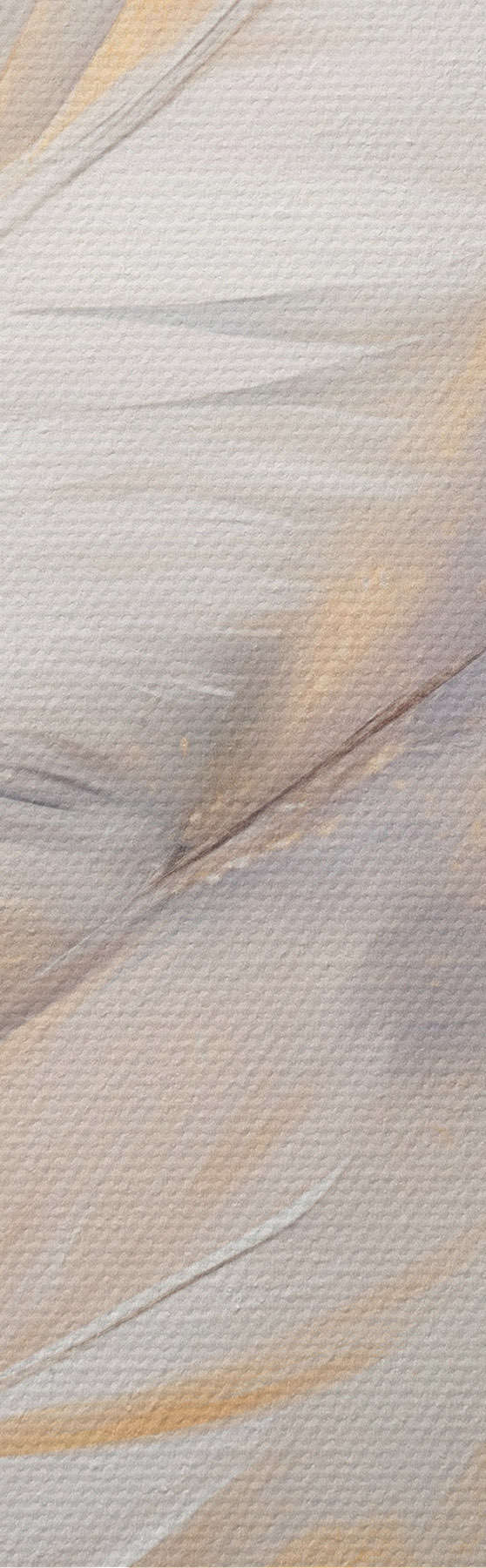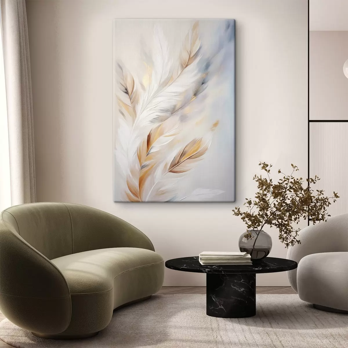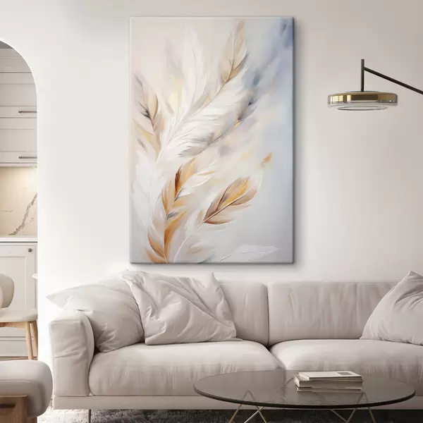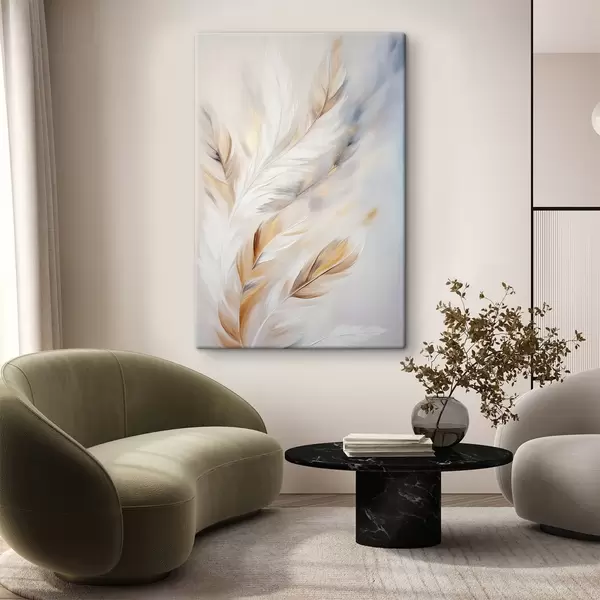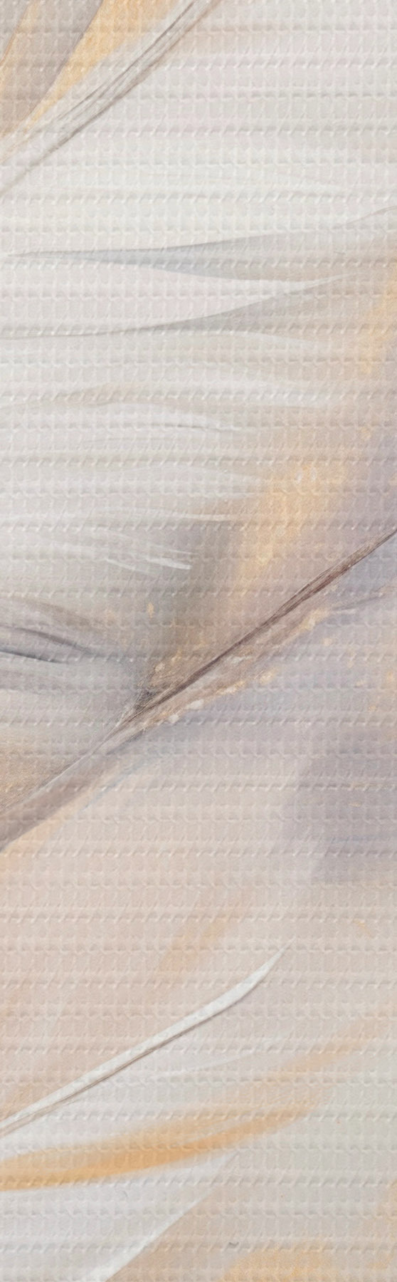 Paveikslas Didelės, minkštos plunksnos, kuriose susipina balti, geltoni ir rudi atspalviai, prieš šviesų, abstraktų foną. Nr s47443