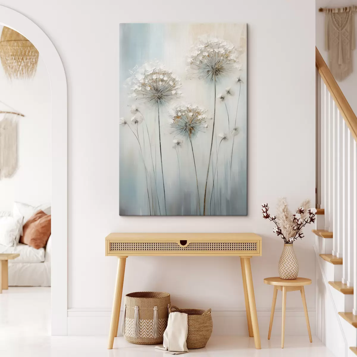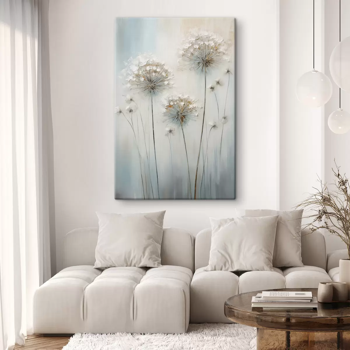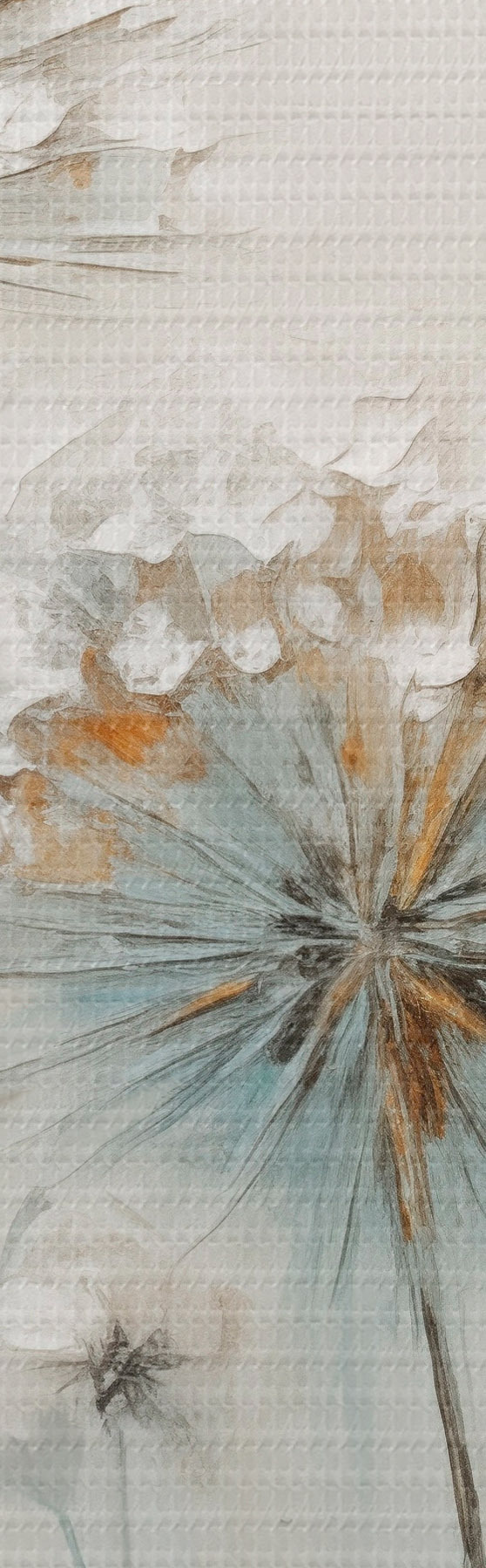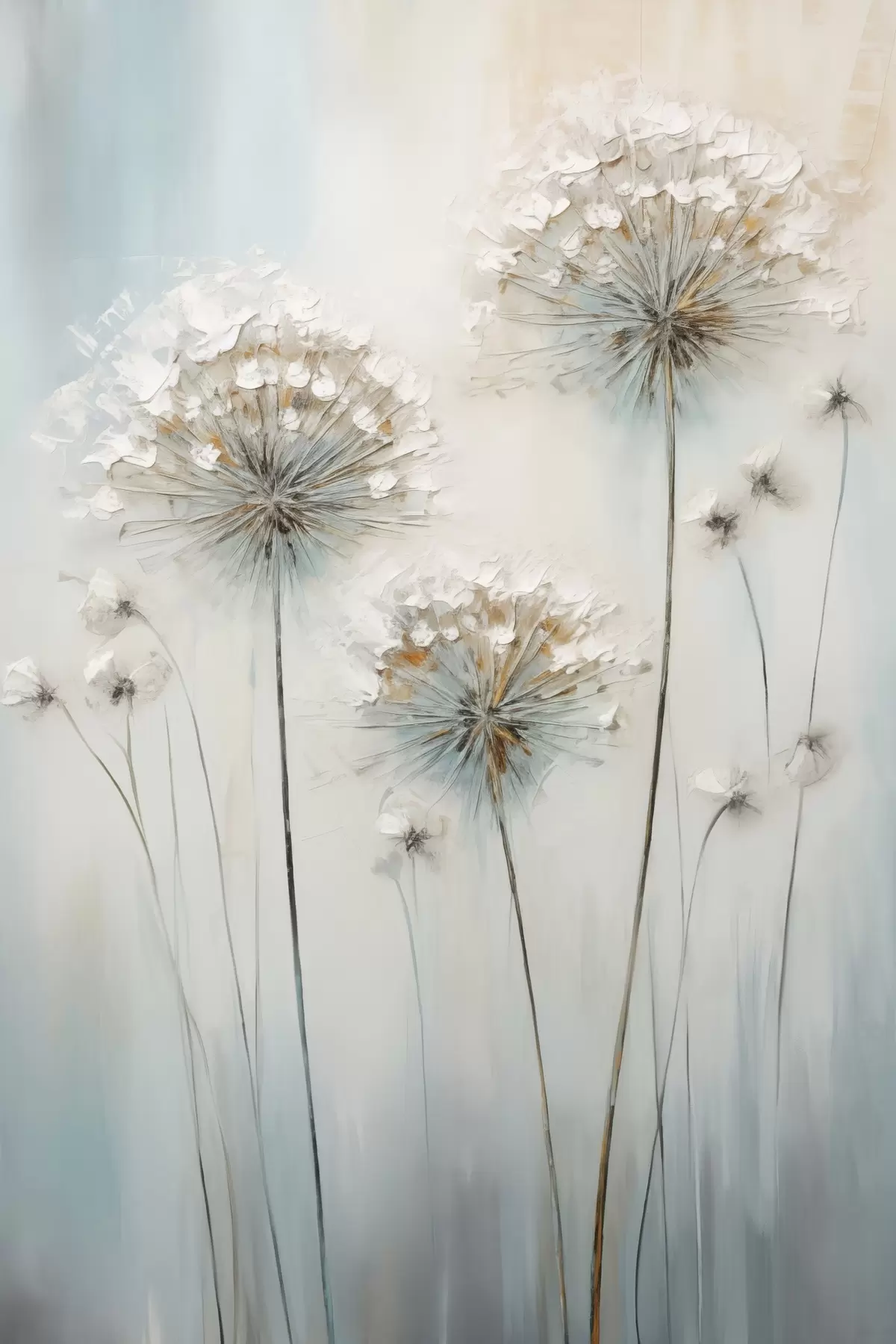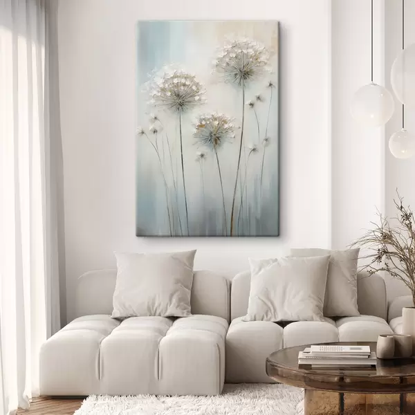 Paveikslas Tekstūrinis tapybos stilius, vaizduojantis kiaulpienes ant švelnaus mėlyno ir balto fono Nr s47855