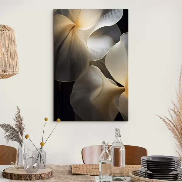 Paveikslas Abstrakčios, permatomos žiedlapių formos figūros su subtiliais kontūrais, kontrastuojančios su tamsiu fonu. Nr s47859