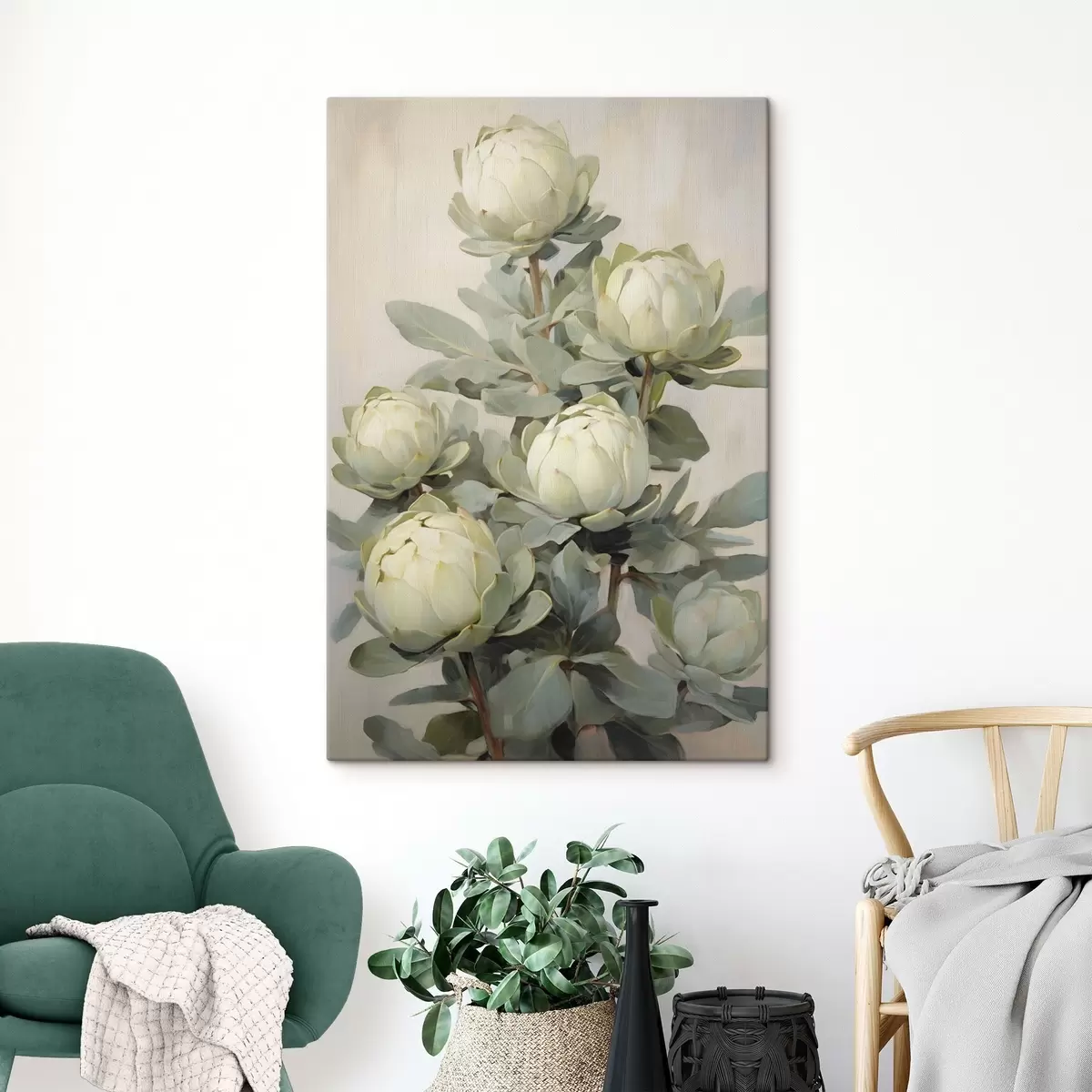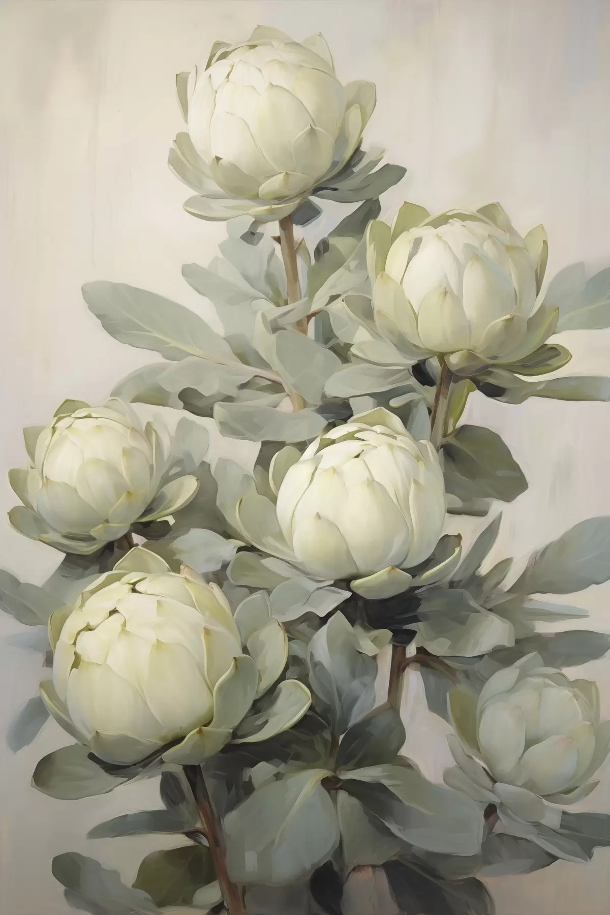Paveikslas Keletas baltų protea gėlių su dideliais žaliais lapais prieš šviesų foną Nr s47861