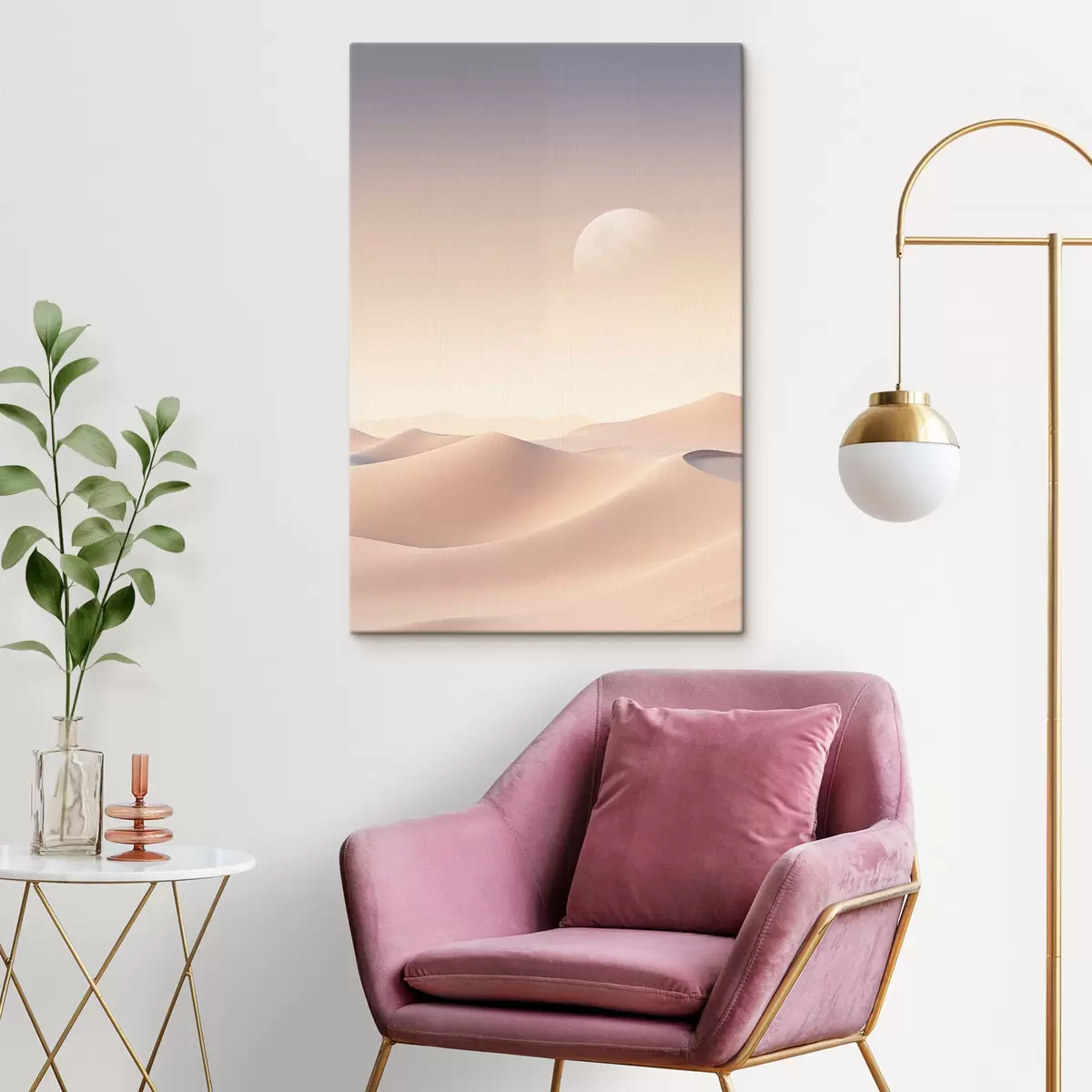 Paveikslas Dykumos kraštovaizdis su banguojančiomis smėlio kopomis po švelniu pastelinės spalvos dangumi, tolumoje matomos kalvos Nr s47866