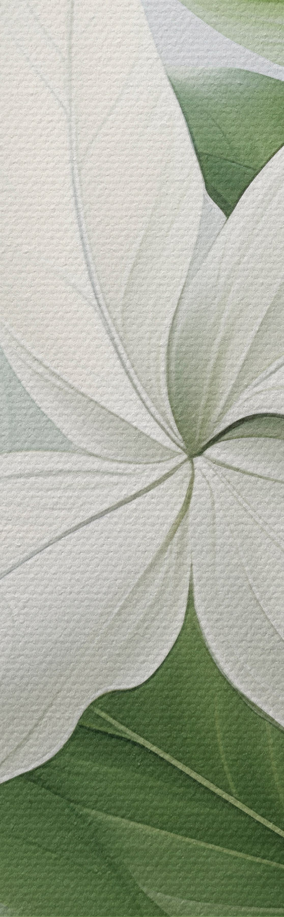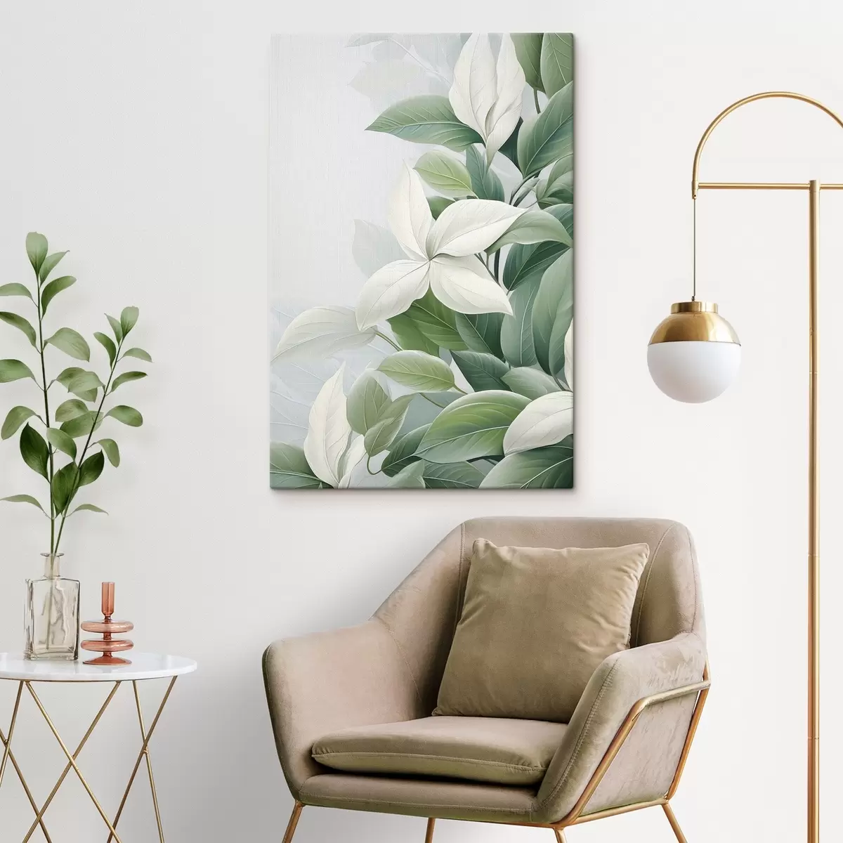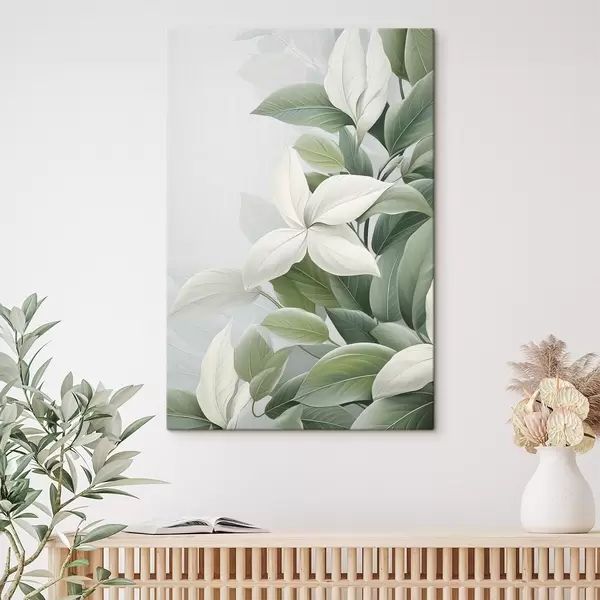Paveikslas Balta gėlė su žaliais lapais, pastelinis fonas Nr s47870