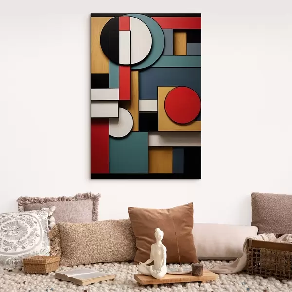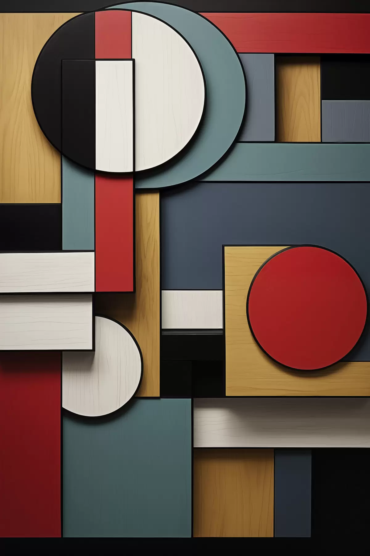 Paveikslas Abstrakčioji geometrinė kompozicija su medžio tekstūros imitacija, raudonais, juodais, baltais ir žaliais stačiakampiais ir apskritimais Nr s47875