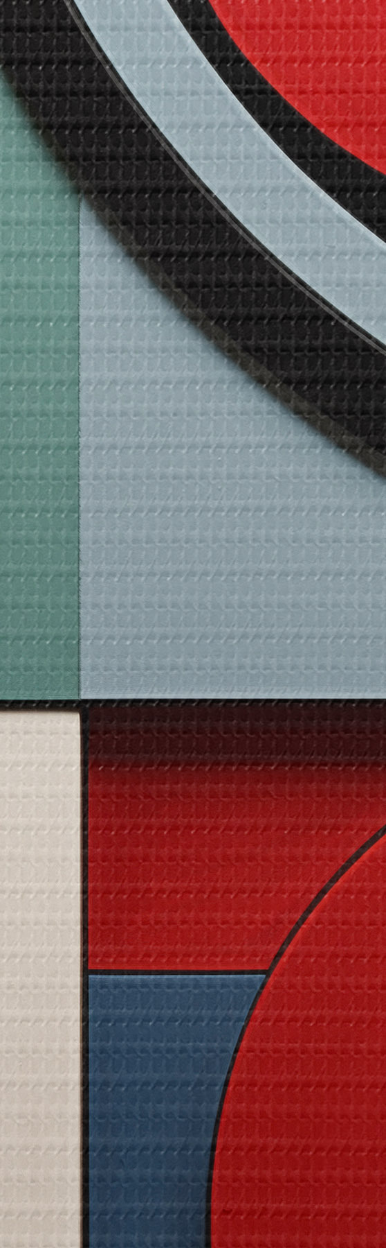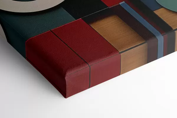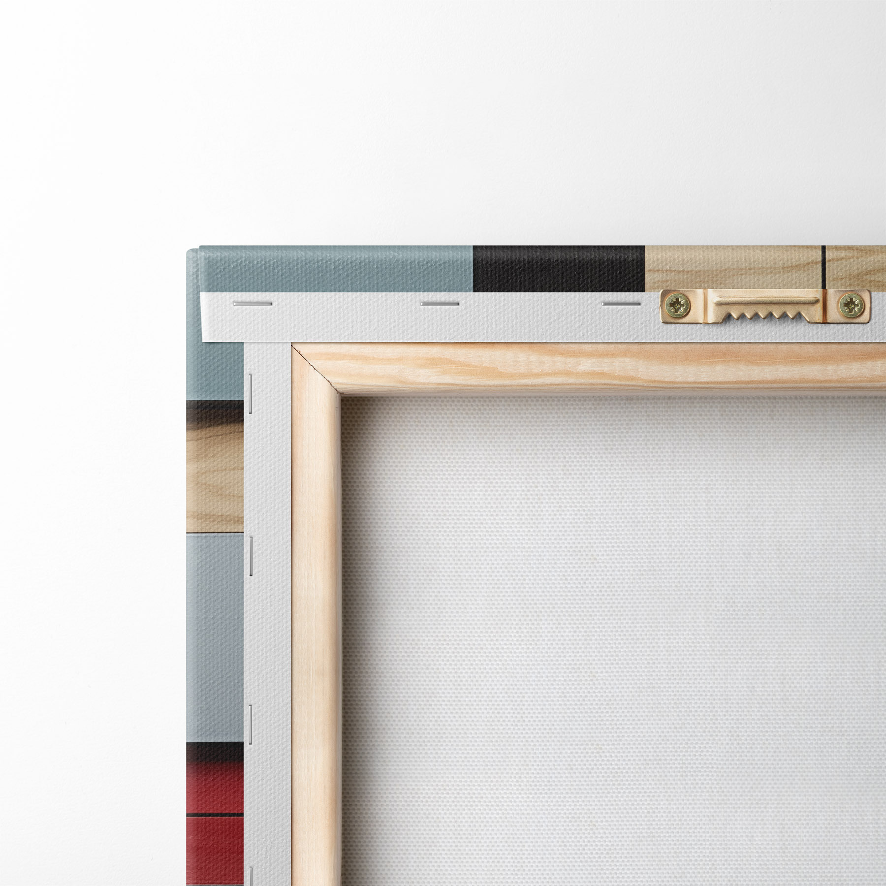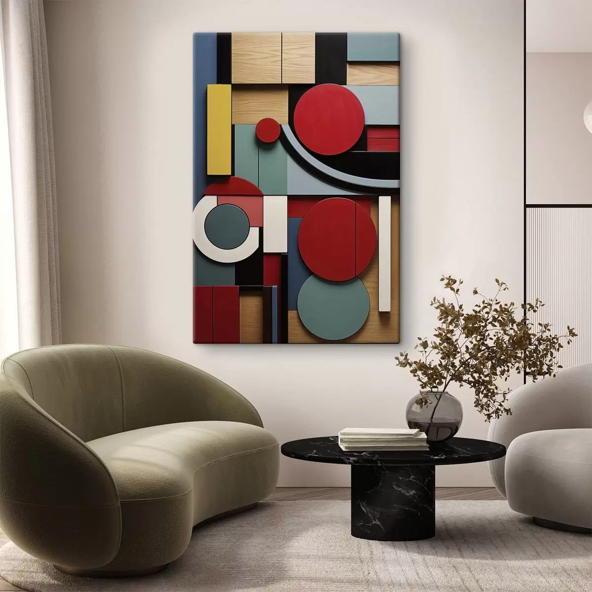 Paveikslas Abstrakčioji geometrinė kompozicija su medžio tekstūros imitacija, raudonais, juodais, baltais ir žaliais stačiakampiais ir apskritimais Nr s47876