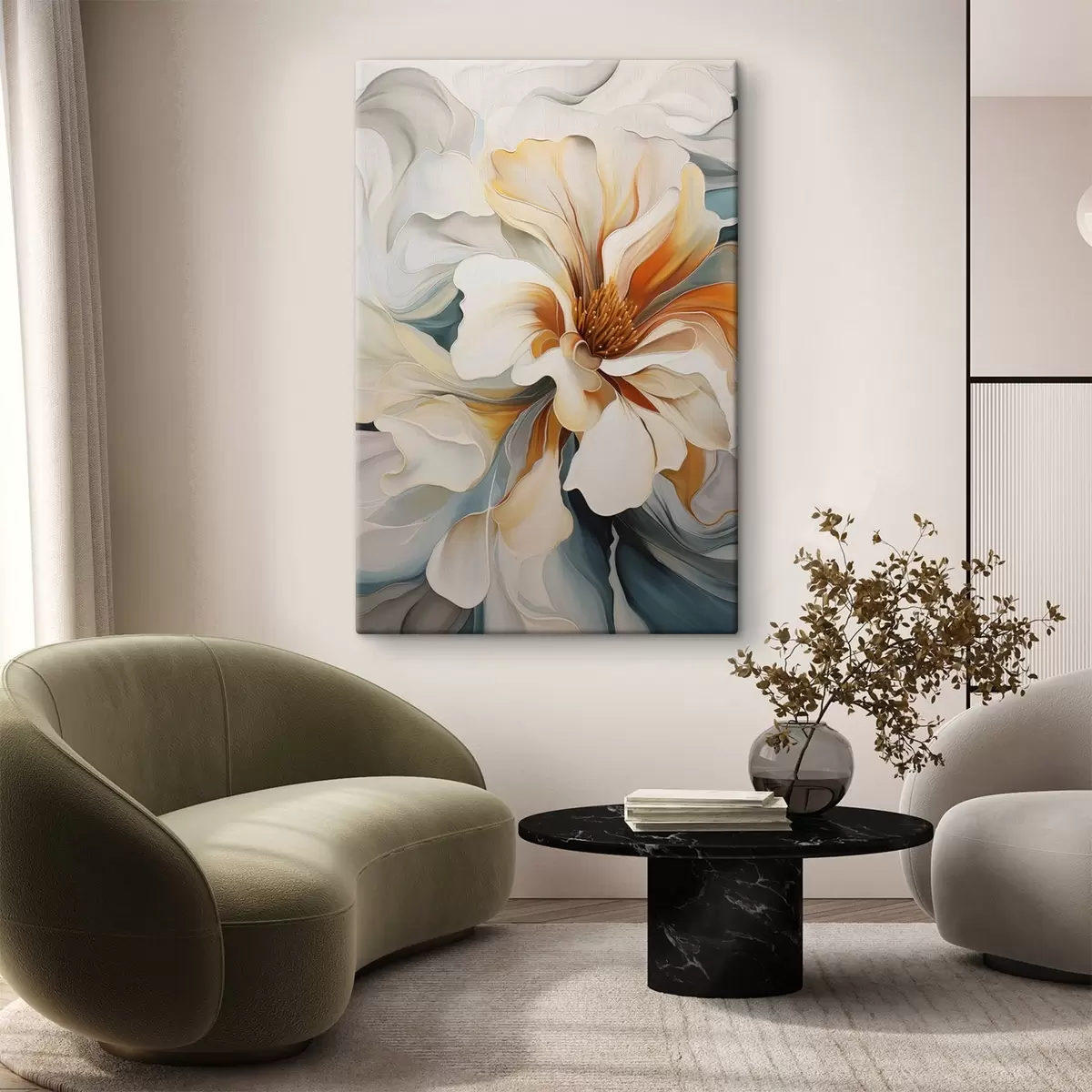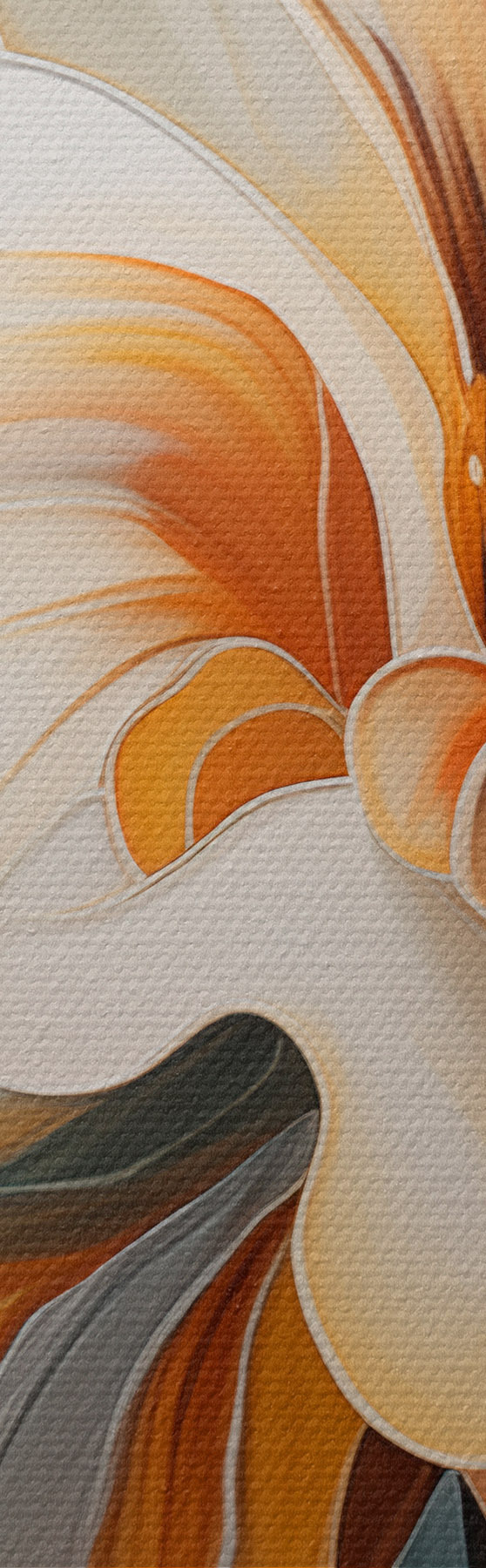 Paveikslas Abstraktus didelis gėlė su baltais, oranžiniais ir žalios spalvos žiedlapiais, tekstūruotu fonu Nr s47877