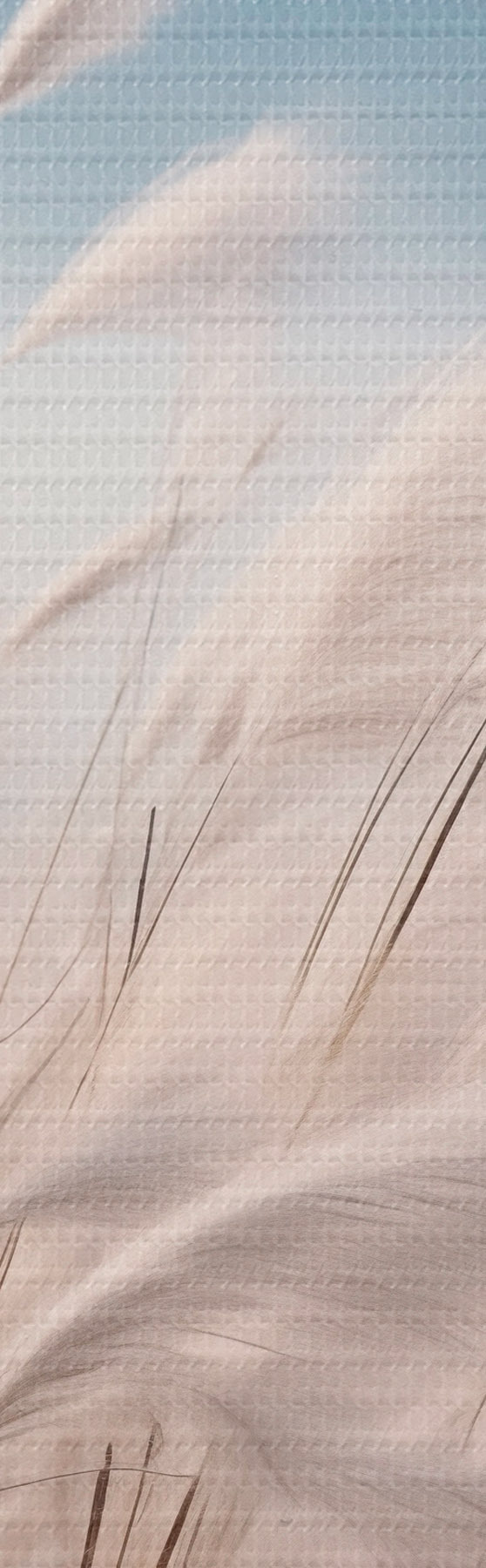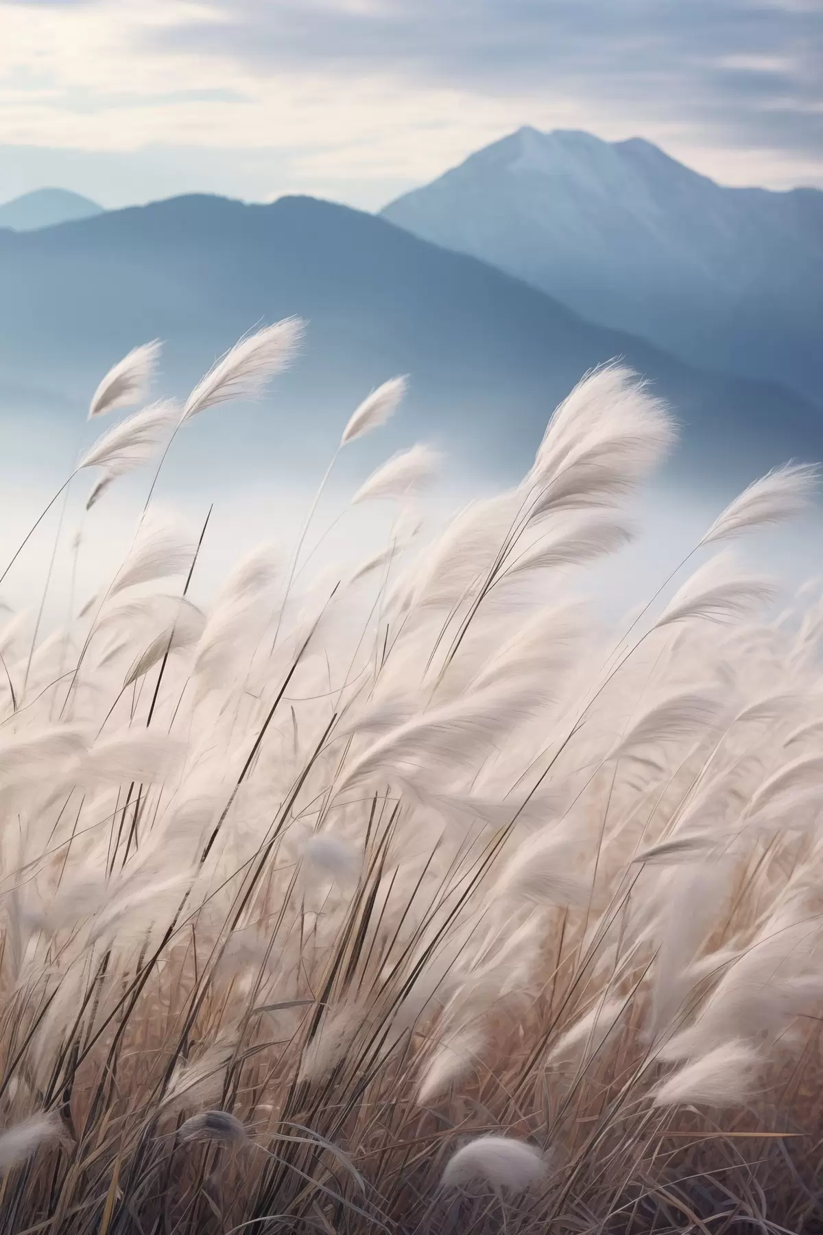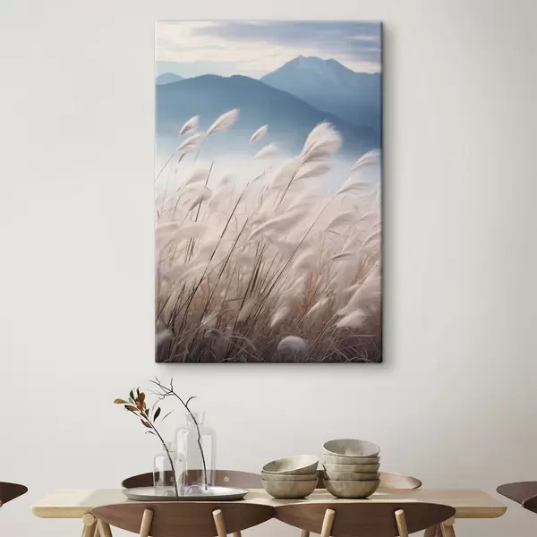 Paveikslas Aukšta, balta pampų žolė, plazdenanti vėjyje, o fone matyti švelnios mėlynos kalvos. Nr s47879