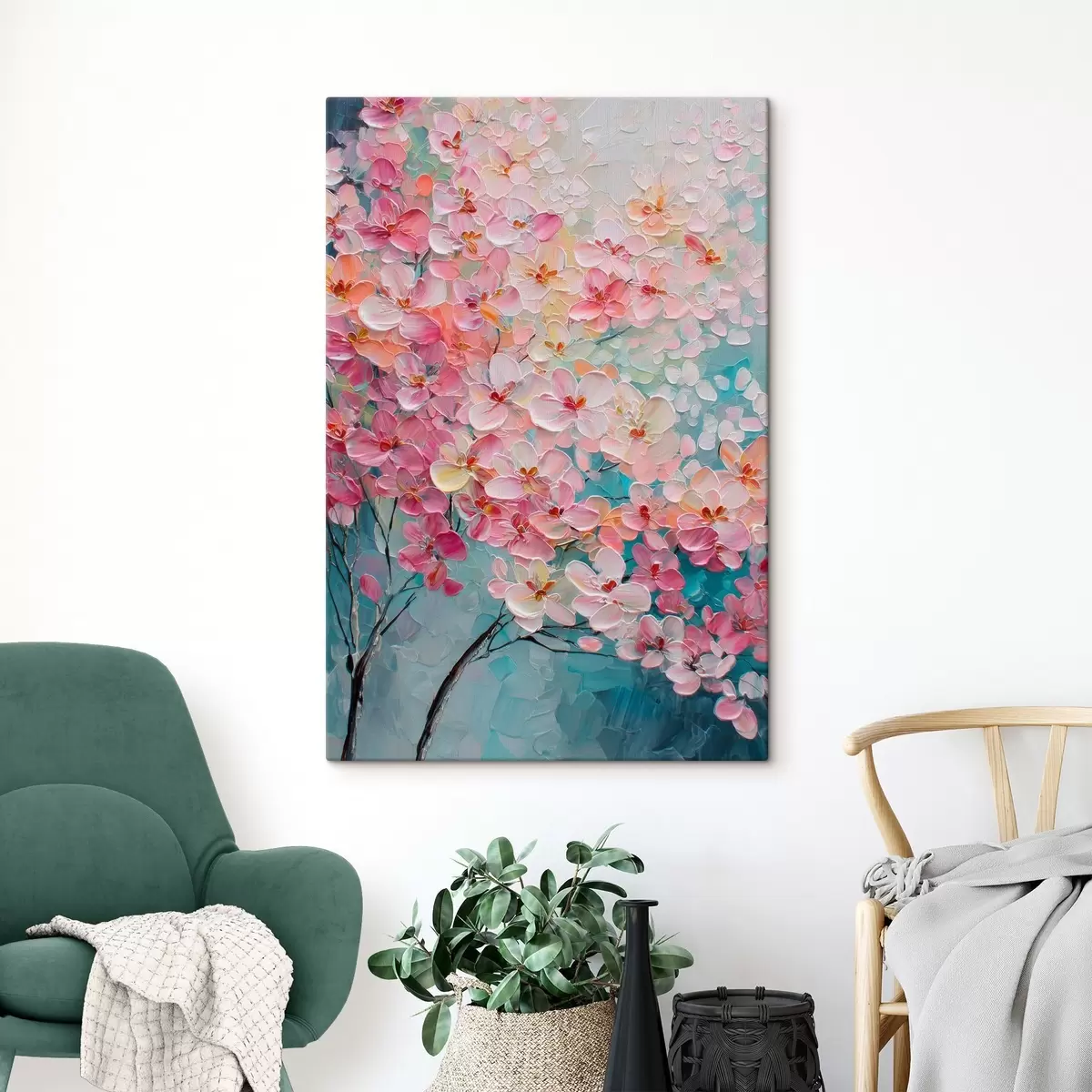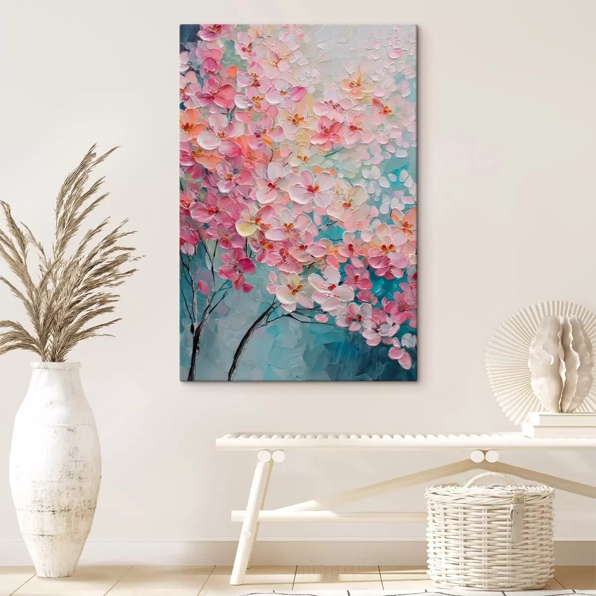 Paveikslas Šaka su rožiniais žiedais mėlyname fone, tapyta aliejiniais dažais Nr s47987