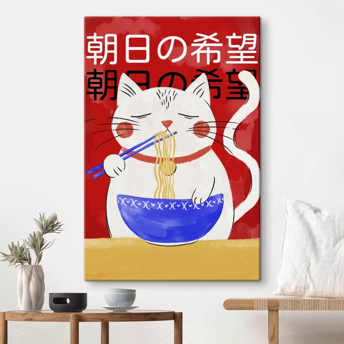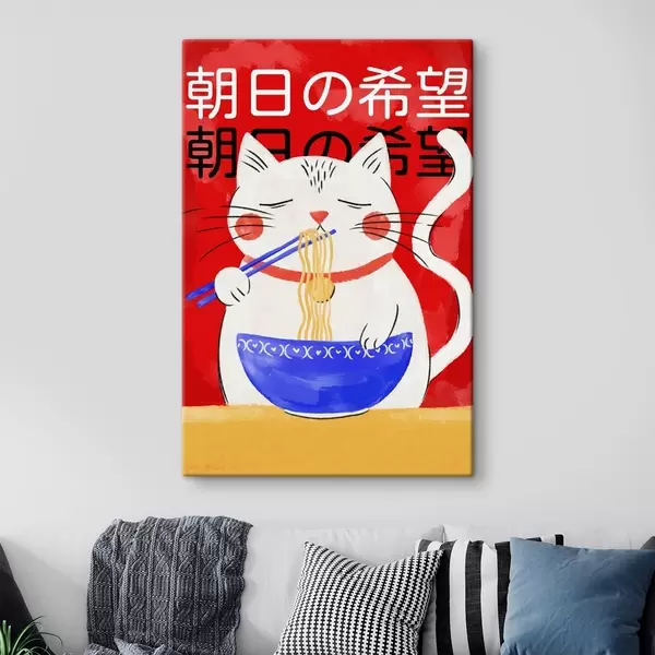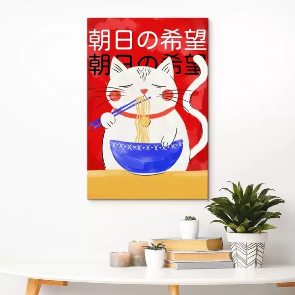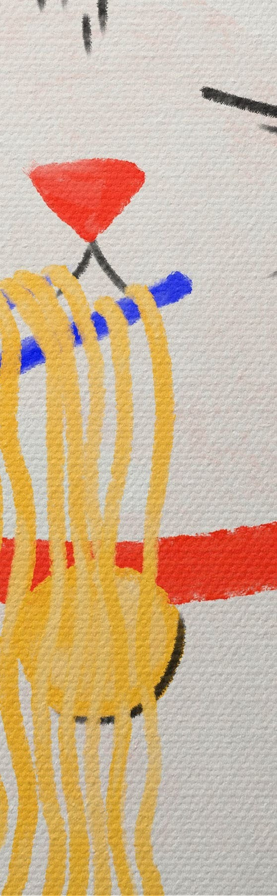 Paveikslas Katė, valganti makaronus, iliustracija raudoname fone Nr s48031