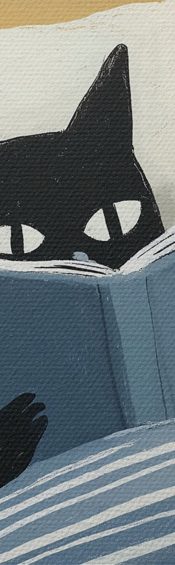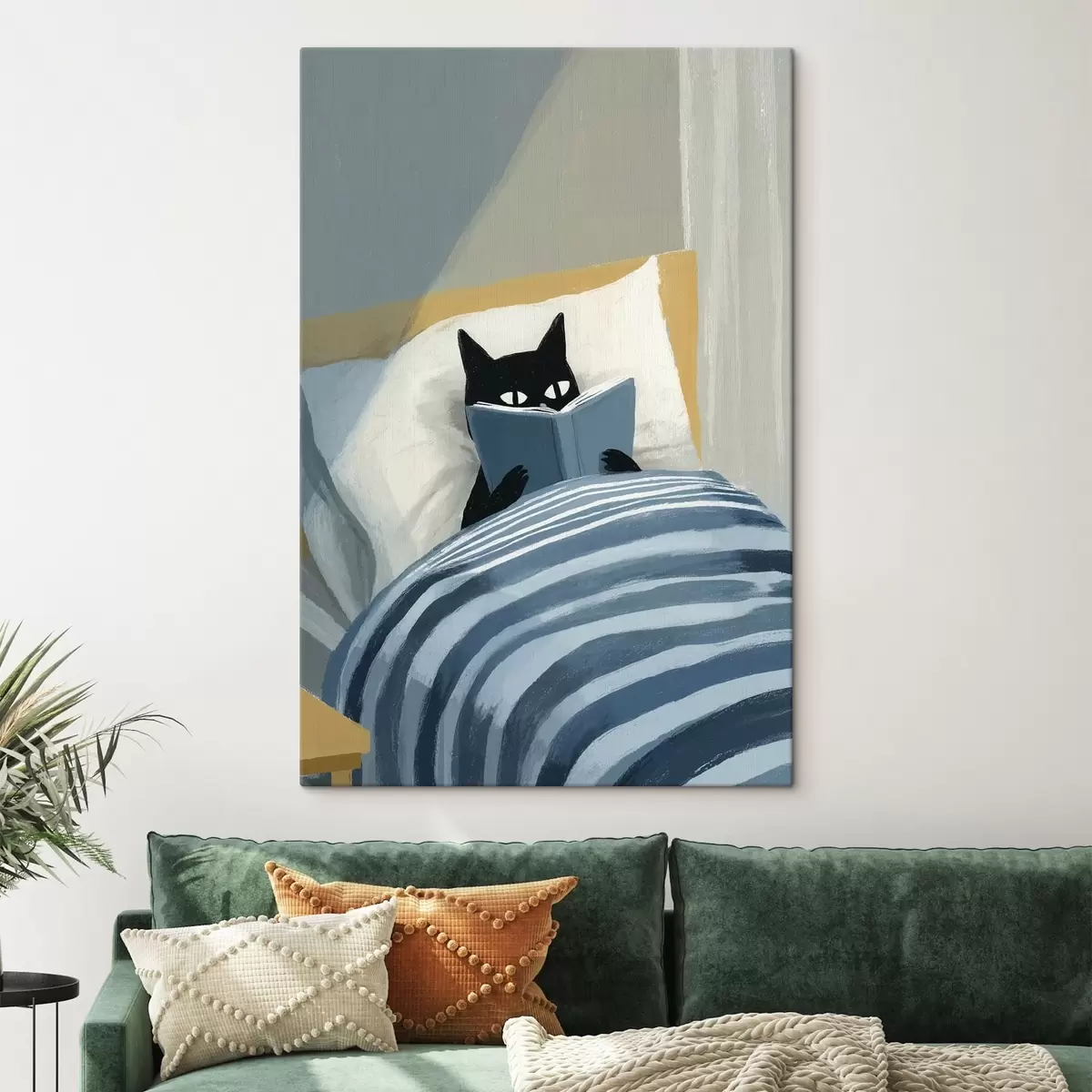 Paveikslas minimalistinė plokščia iliustracija, vaizduojanti juodą katę, skaitančią knygą lovoje Nr s48117