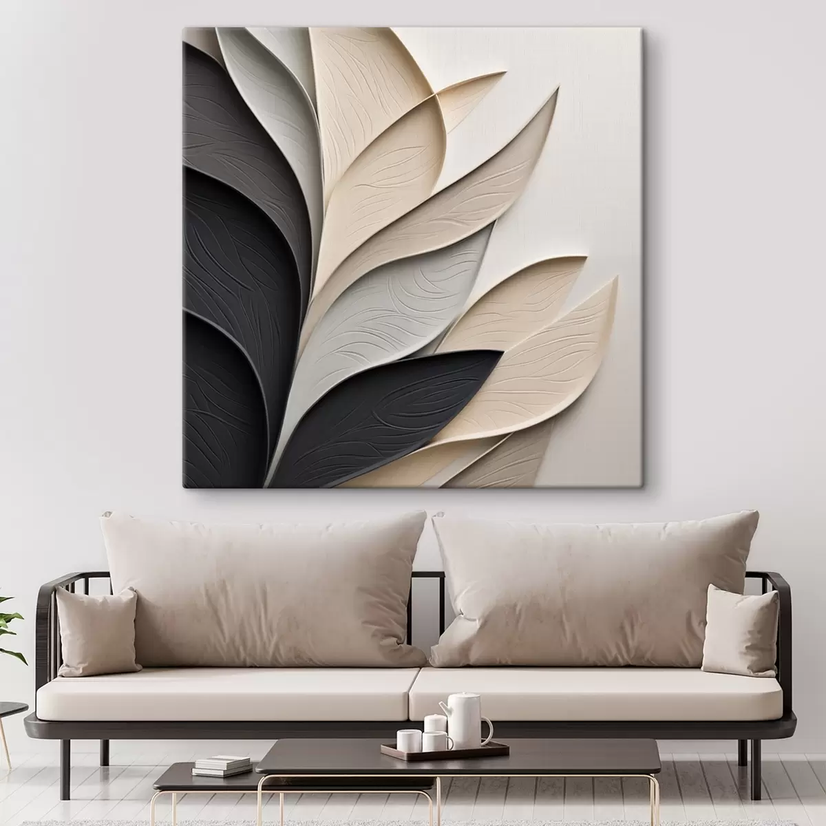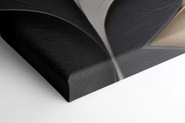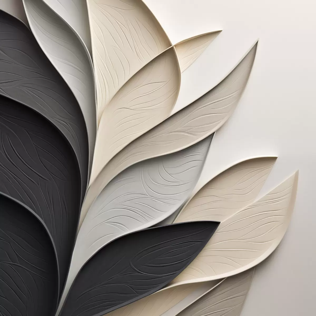 Paveikslas Abstrakti kompozicija iš sluoksniuotų lapų, išlenktų formų juodos, baltos ir smėlio spalvos, tekstūrinis menas Nr s48382