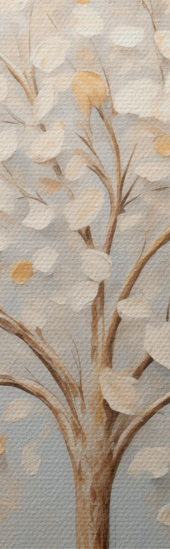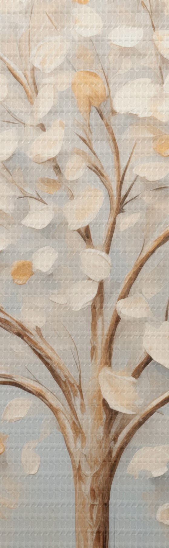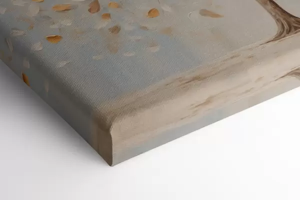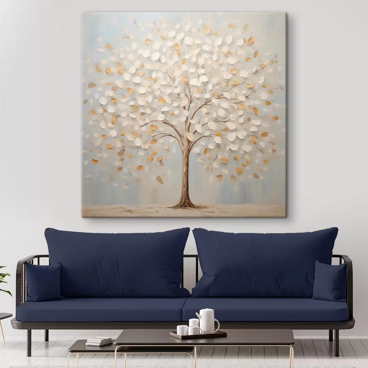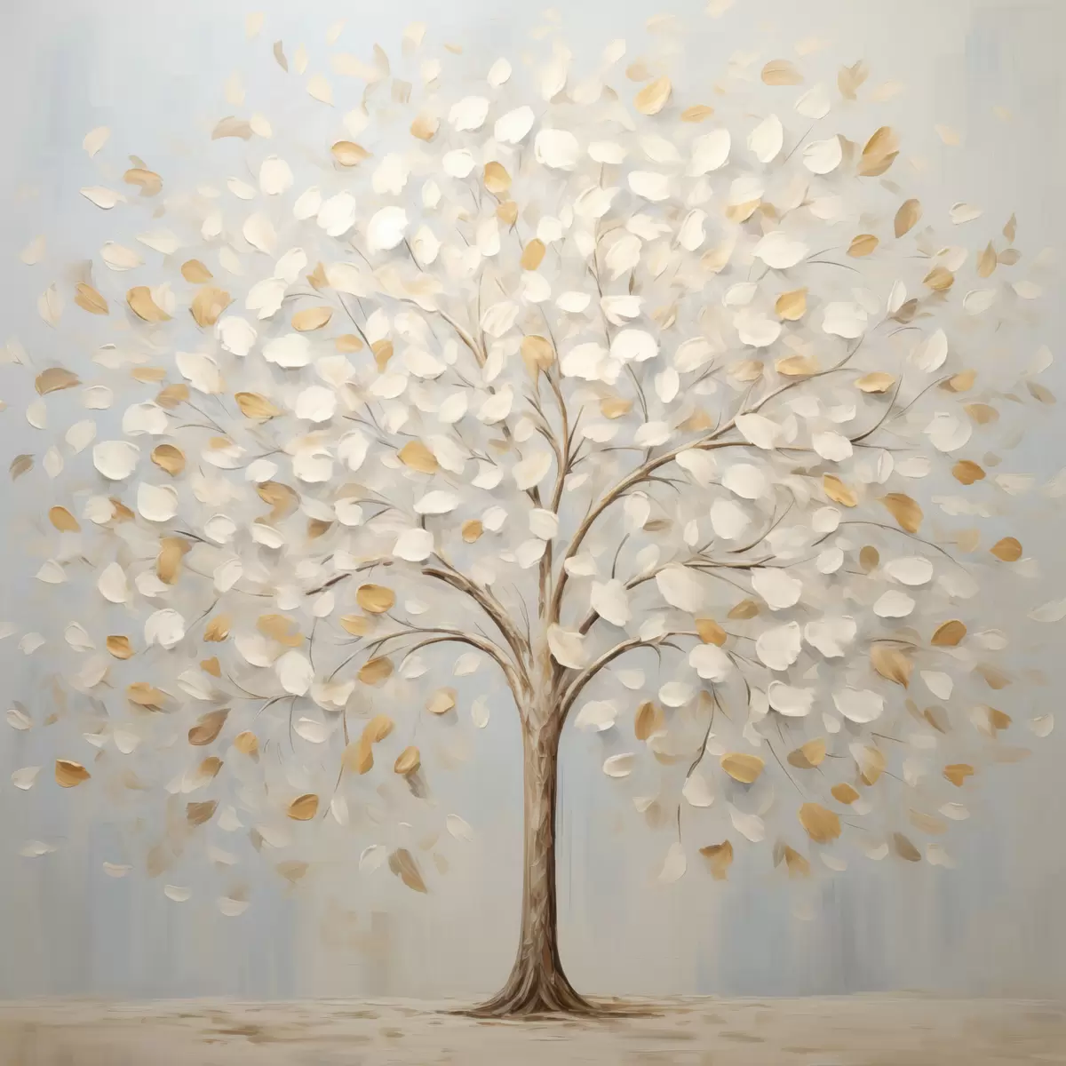 Paveikslas Tekstūrinis paveikslas, vaizduojantis medį su baltais ir geltonais lapais prieš šviesiai mėlyną foną Nr s48391