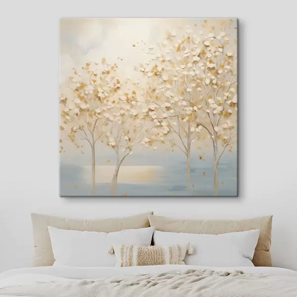 Paveikslas Tekstūrinis tapybos stilius, vaizduojantis medžius su baltais ir geltonais lapais prieš šviesiai mėlyną foną Nr s48392