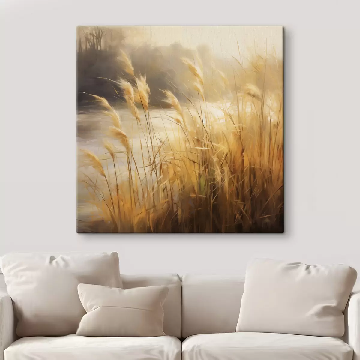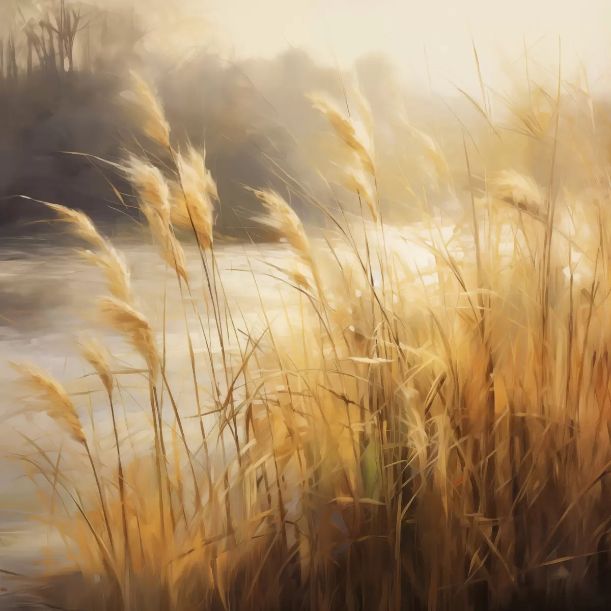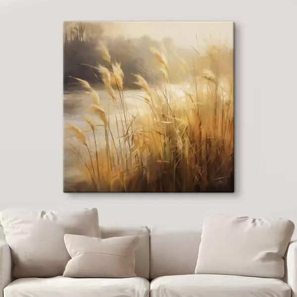 Paveikslas Pirmame plane – aukšta, išdžiūvusi žolė su varpeliais, o fone – ežeras ir medžiai Nr s48394