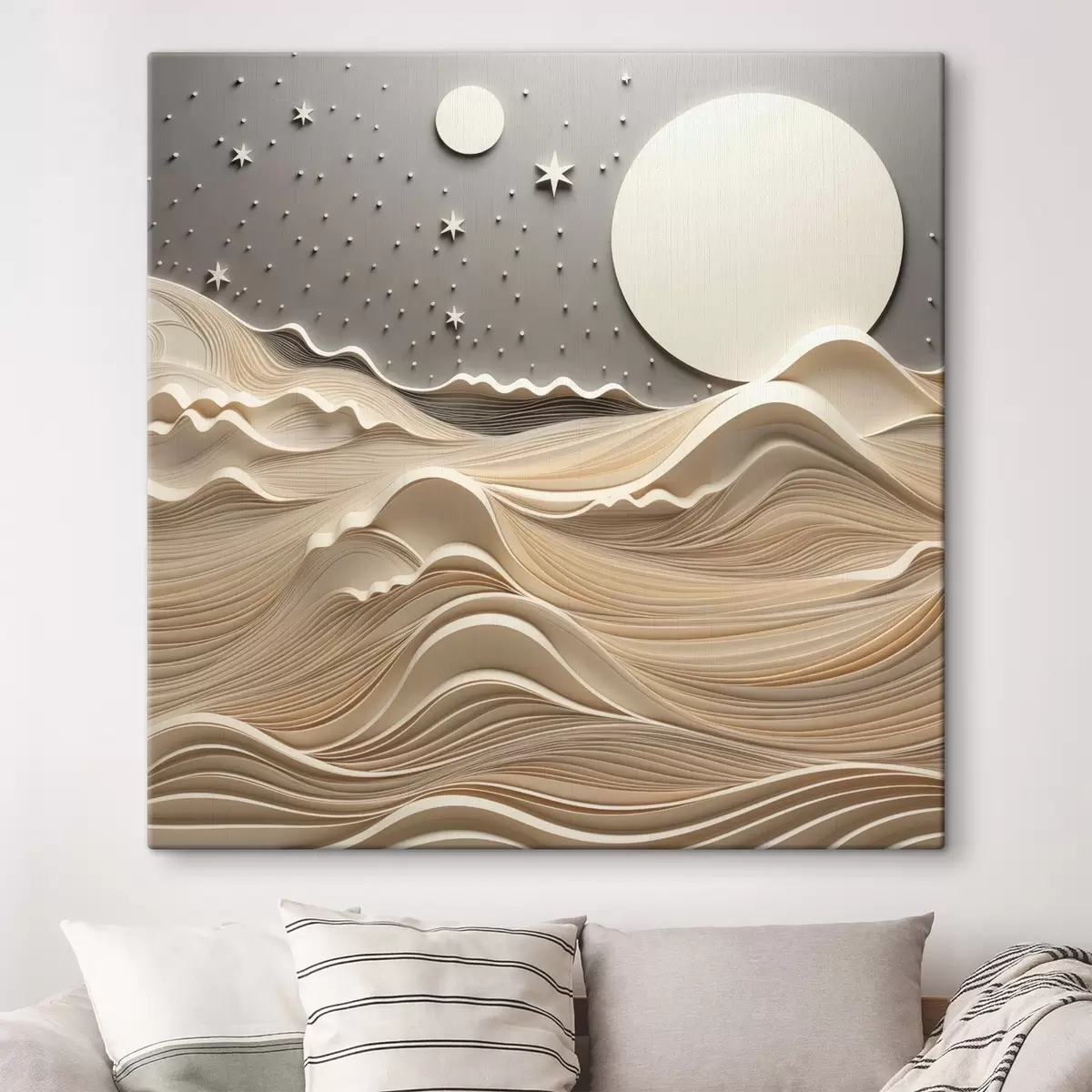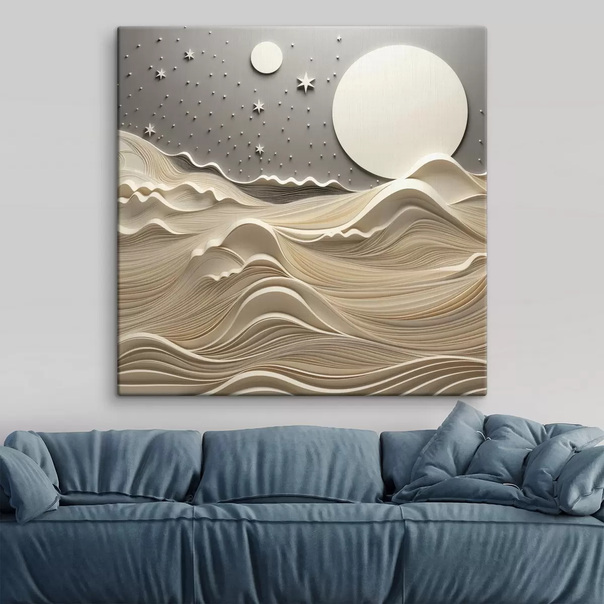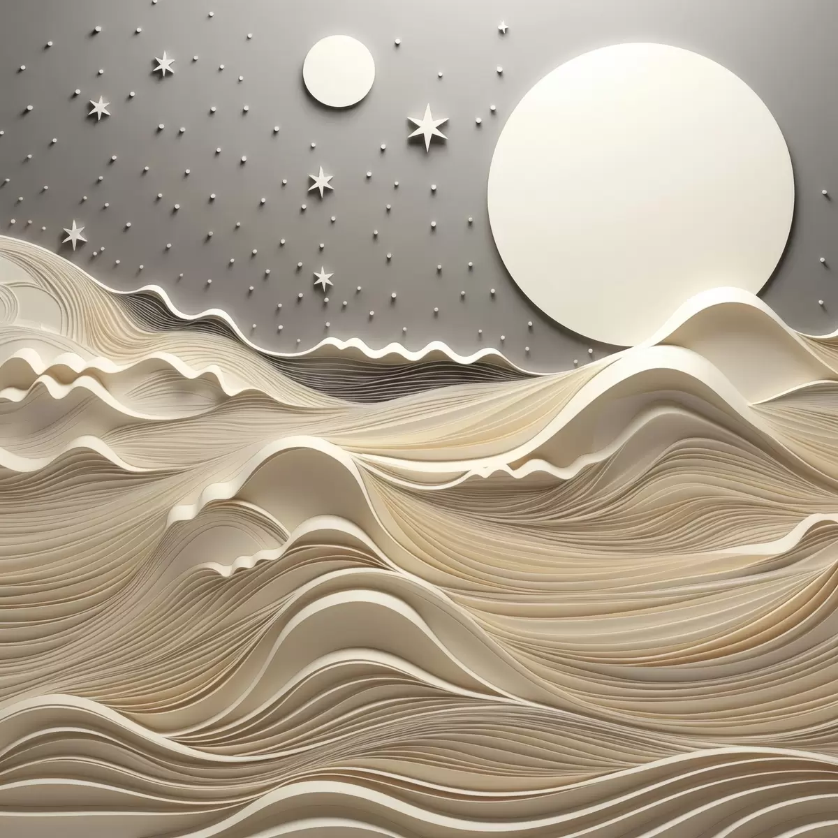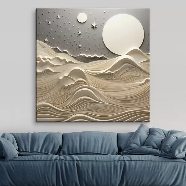 Paveikslas Minimalistinis stilizuotas peizažas su banguotais kalnais ir dideliu mėnesiu žvaigždėtame danguje, abstraktusis menas Nr s48401