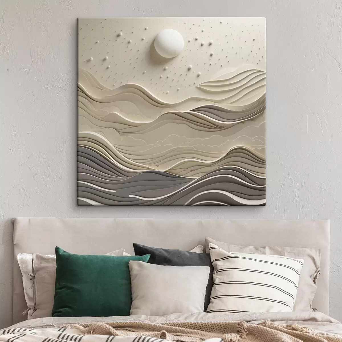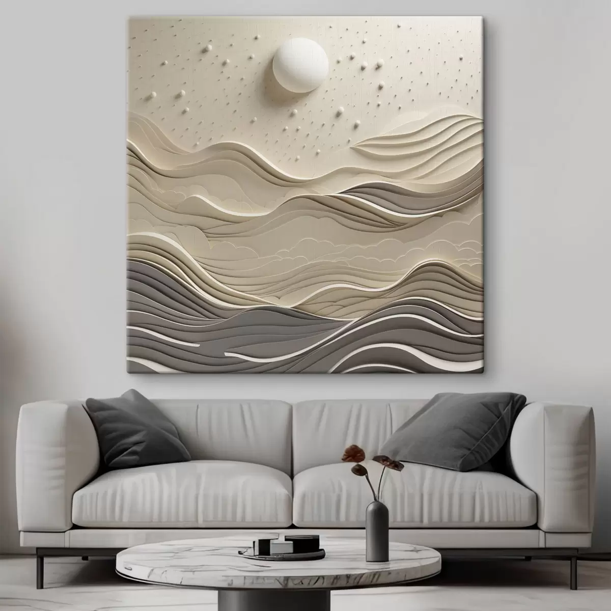 Paveikslas Minimalistinis stilizuotas peizažas su banguotais kalnais ir dideliu mėnesiu žvaigždėtame danguje, abstraktusis menas Nr s48402