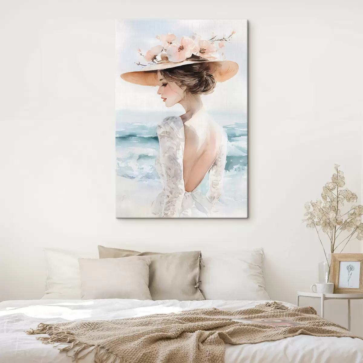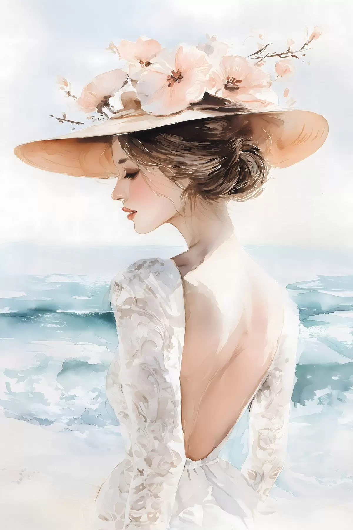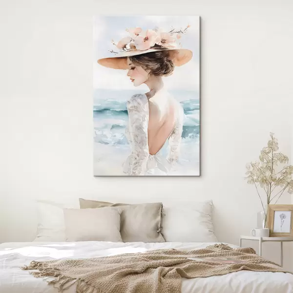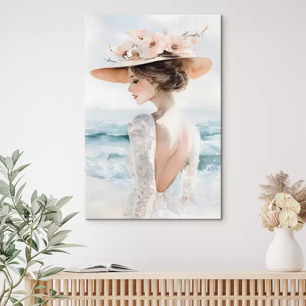 Paveikslas romantiška mergina prie jūros, dėvinti skrybėlę Nr s48547