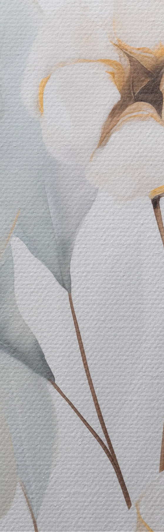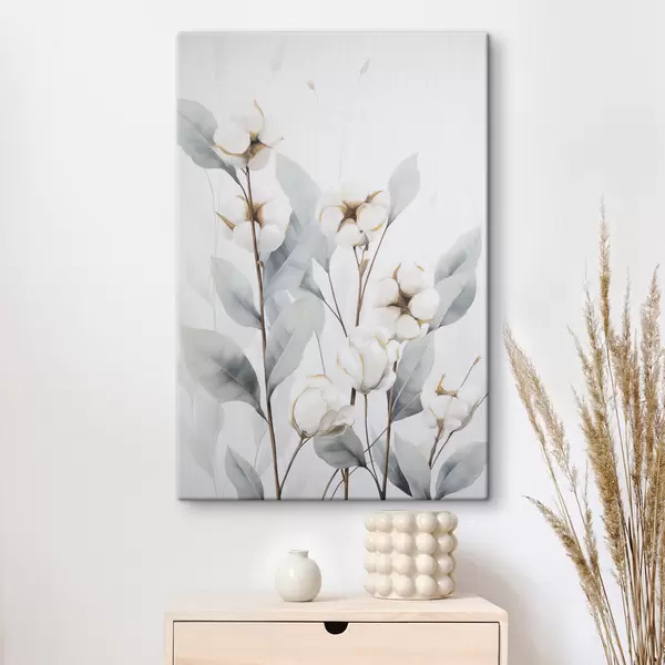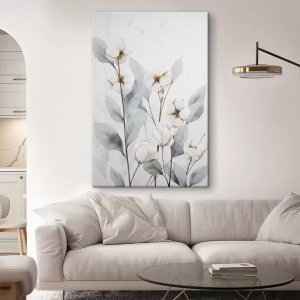 Paveikslas Balta medvilnės augalas su šviesiai mėlynai žaliais lapais prieš šviesų foną Nr s48744