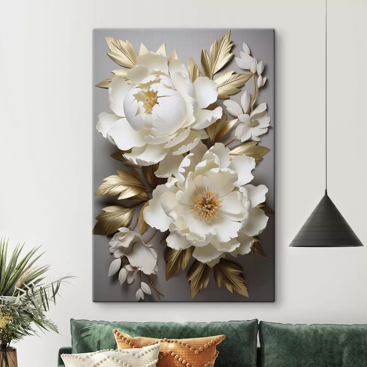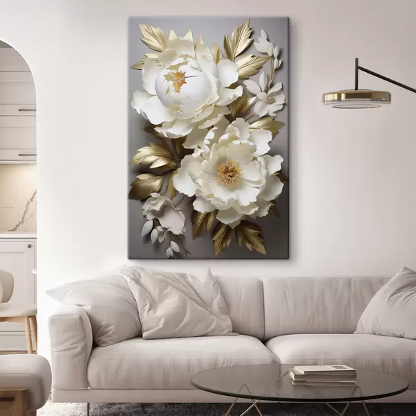 Paveikslas Didelės baltos bijūnės su geltonais lapais ant pilko fono Nr s48753