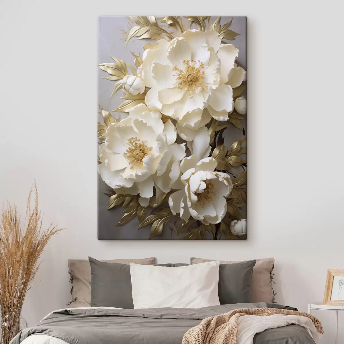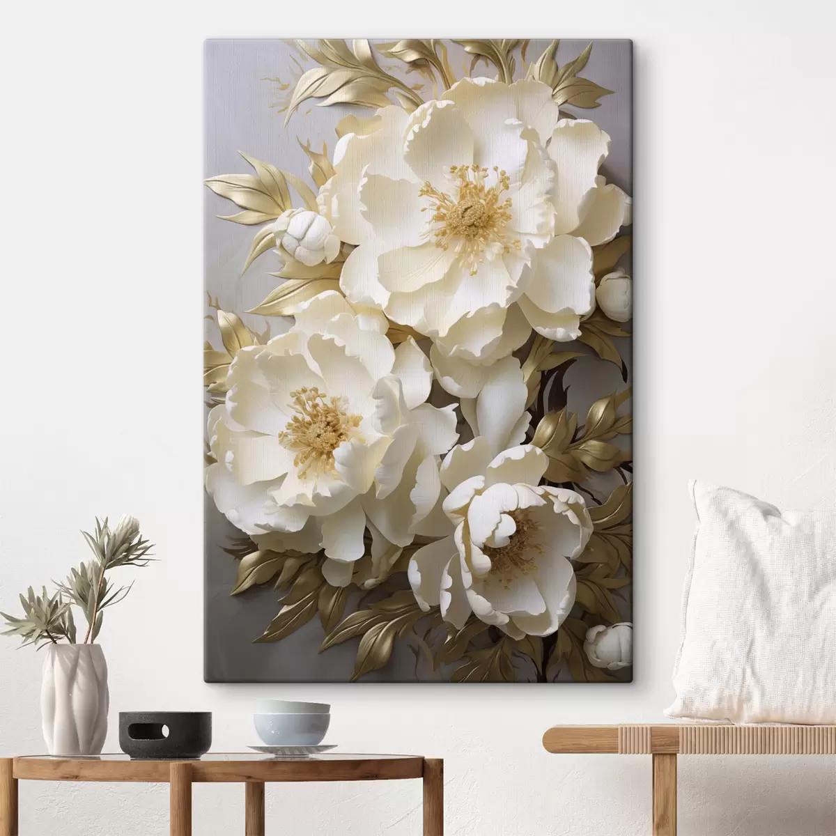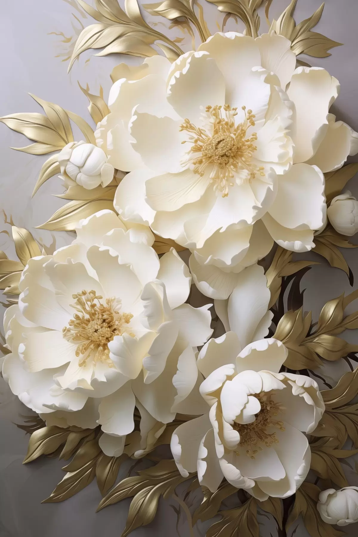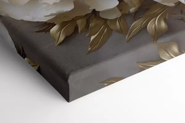 Paveikslas Didelės baltos bijūnės su geltonais lapais ant pilko fono Nr s48754