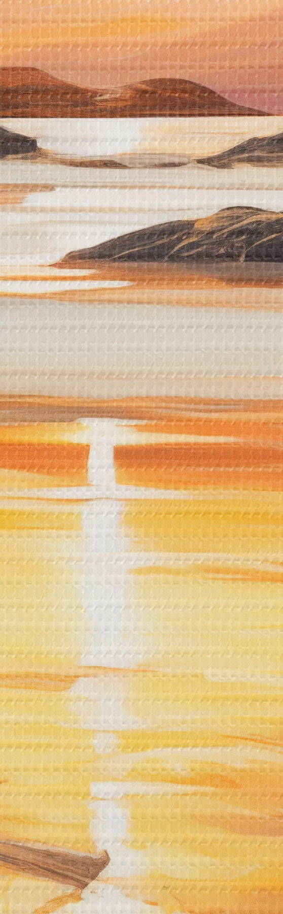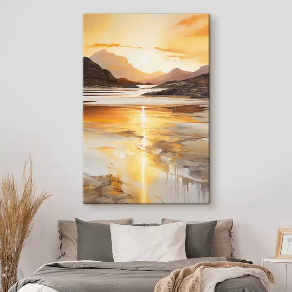 Paveikslas Peizažas su upe ir kalnais po šiltu oranžiniu dangumi, saulėlydis Nr s48755
