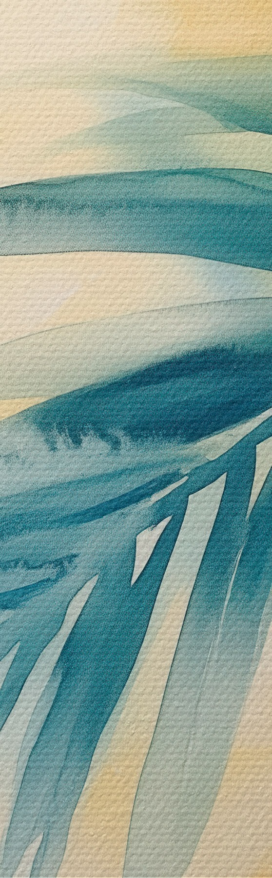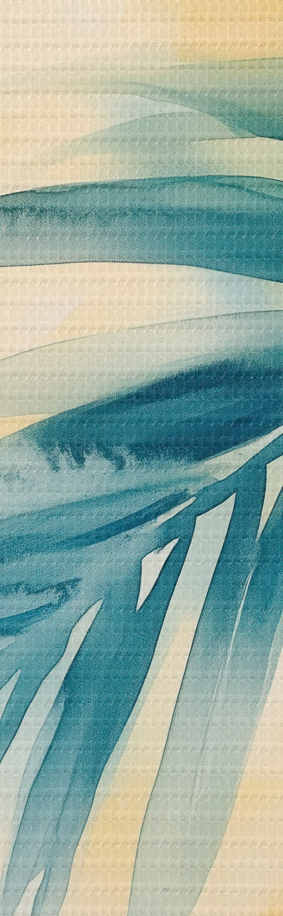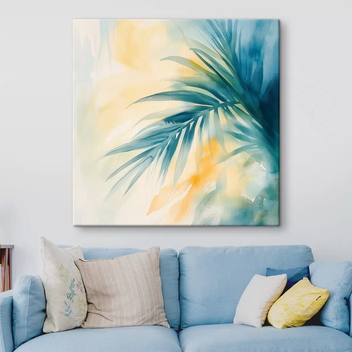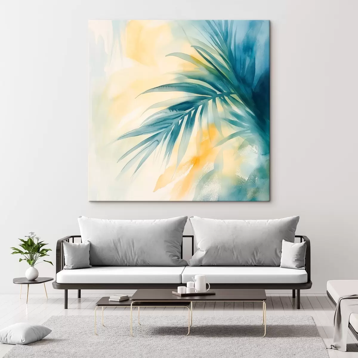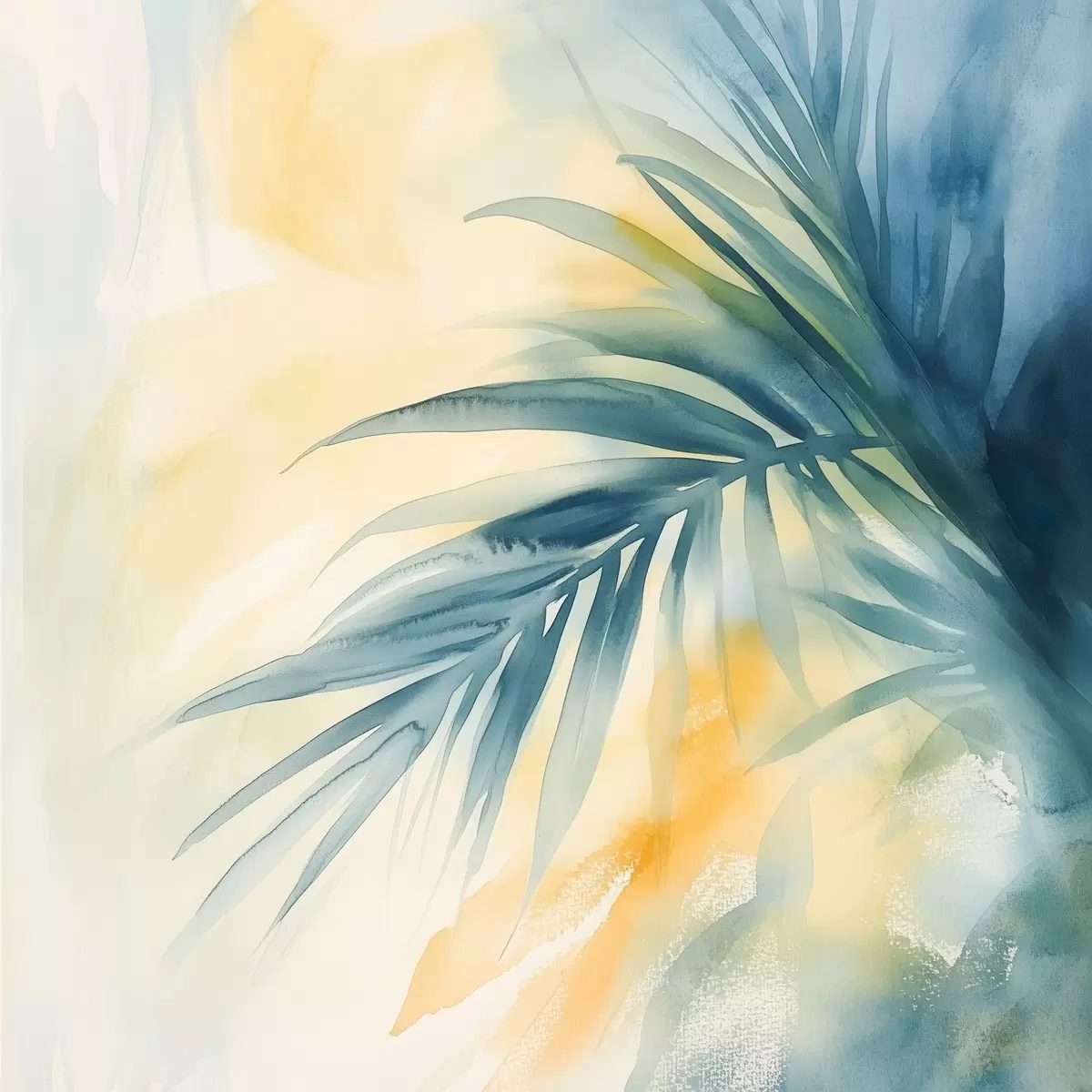Paveikslas Tropinių palmių lapai mėlynos ir turkio spalvų paletėje šiltų akvarelės dėmių fone Nr s48849