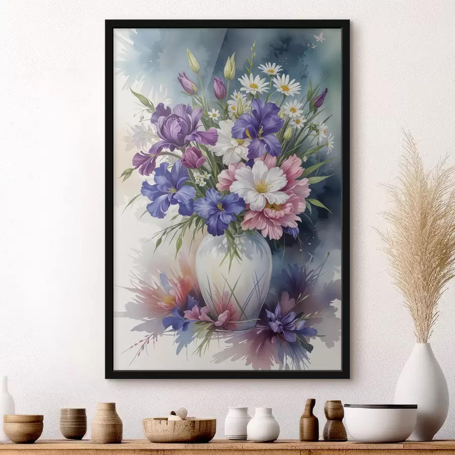 Spalvingų gėlių puokštė, švelnus akvarelės stilius, šviesiame fone