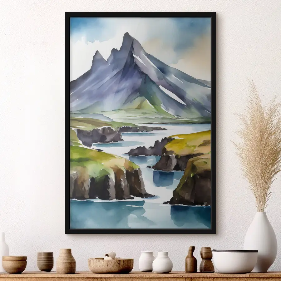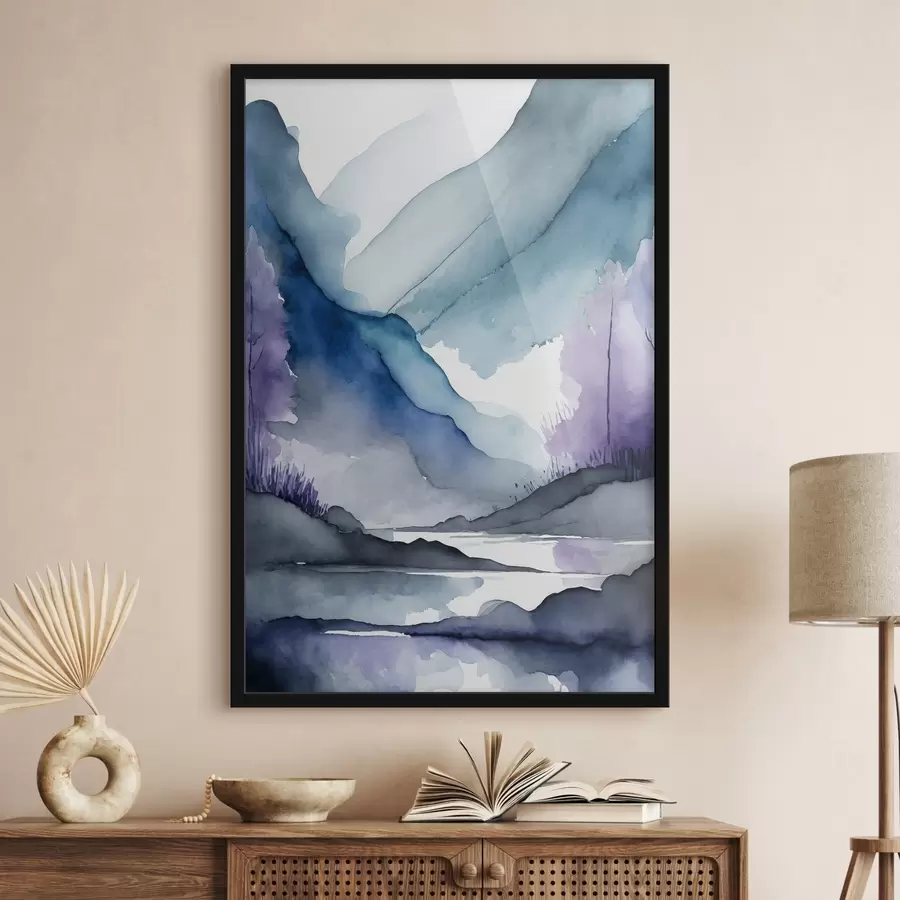 Akvarelės stiliaus ežeras netoli kalno