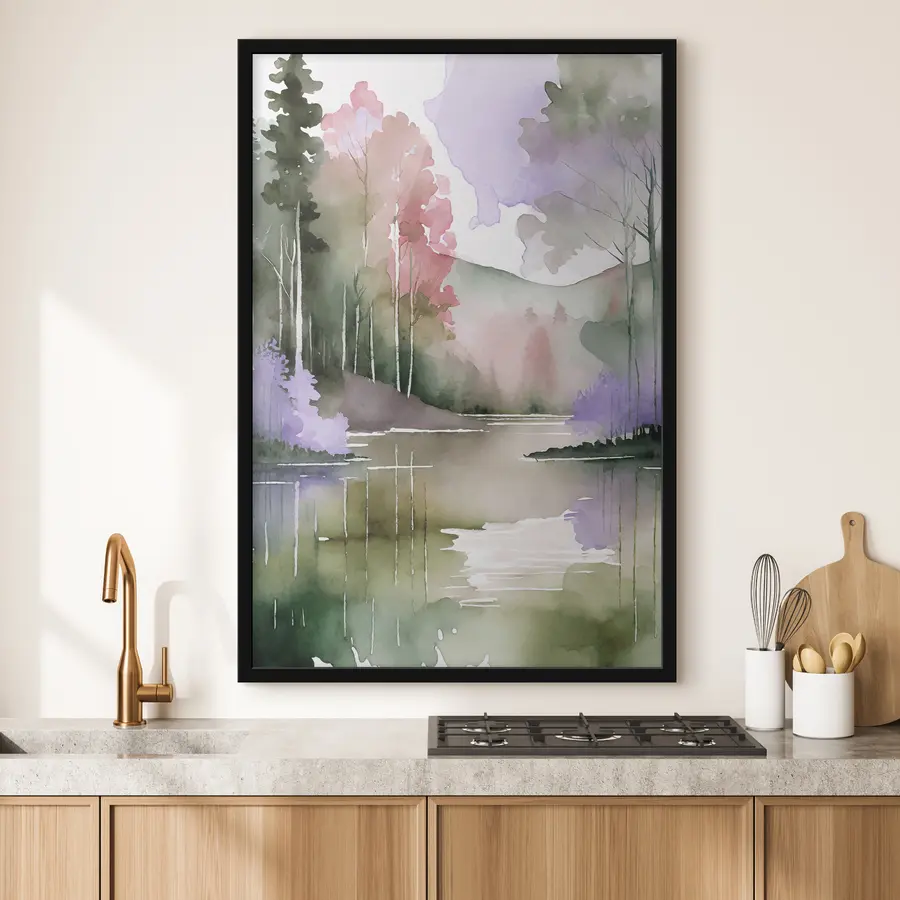 Gamtos peizažas su upe, mišku ir pušimis, švelnios pastelinės spalvos
