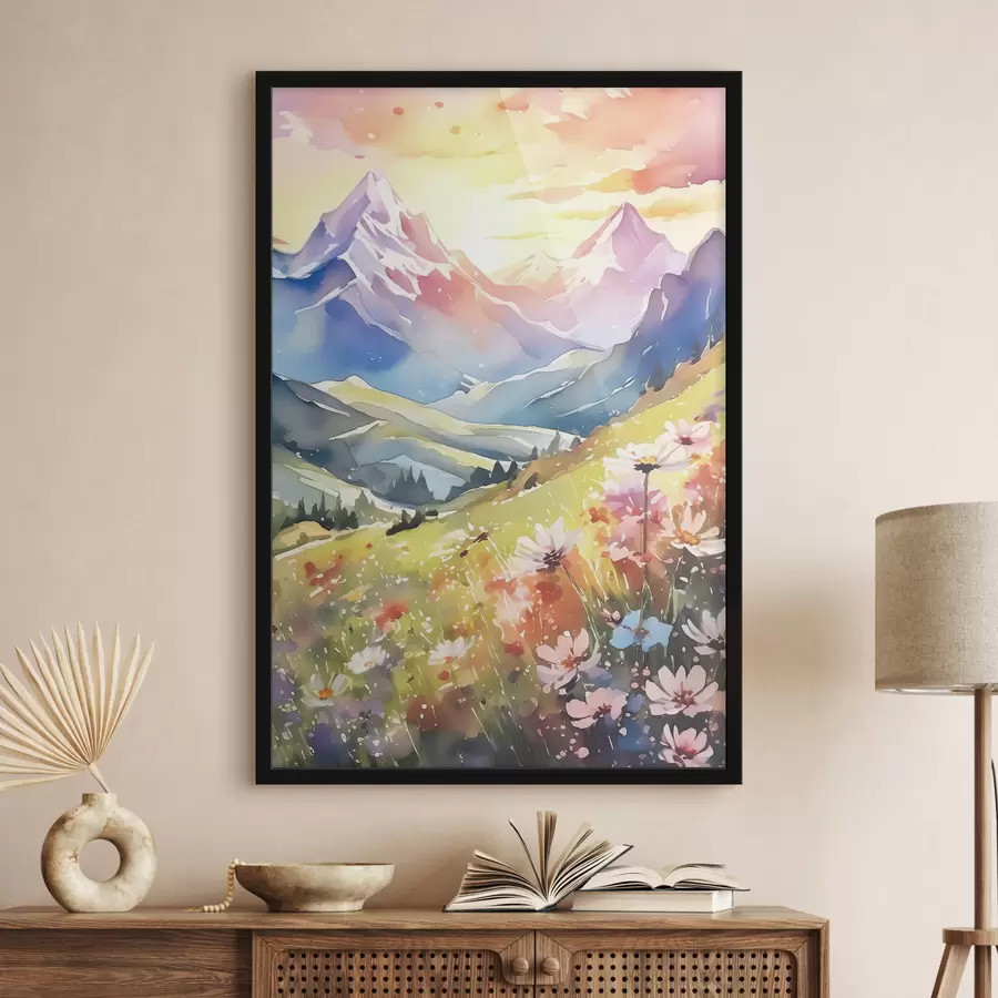 Vasaros kalnai, spalvingas saulėlydis, gėlės, akvarelė, gamtos peizažai