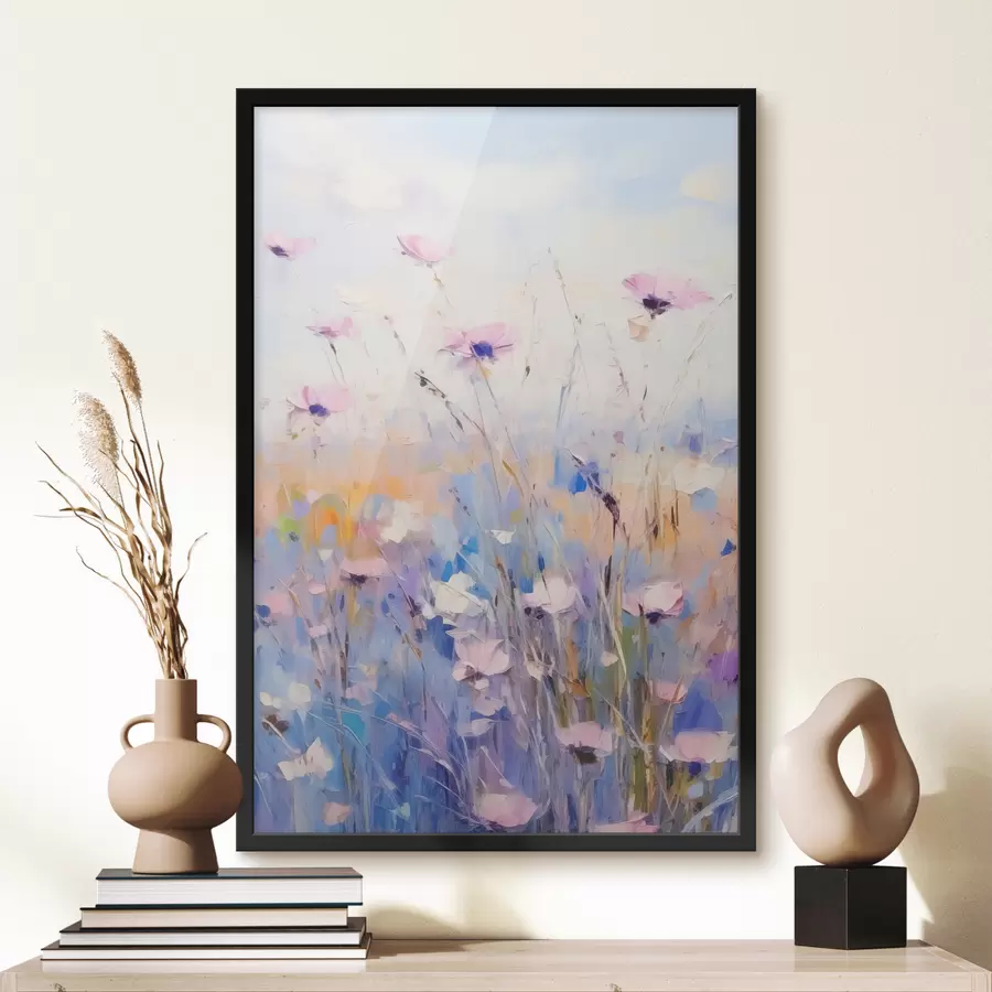 Žydinčios rugiagėlės laukinės gėlės aliejiniame lauko paveiksle, mėlynos, rožinės, violetinės, oranžinės spalvos