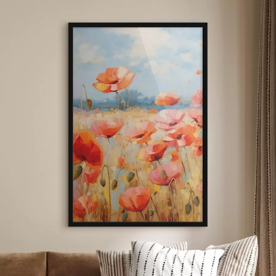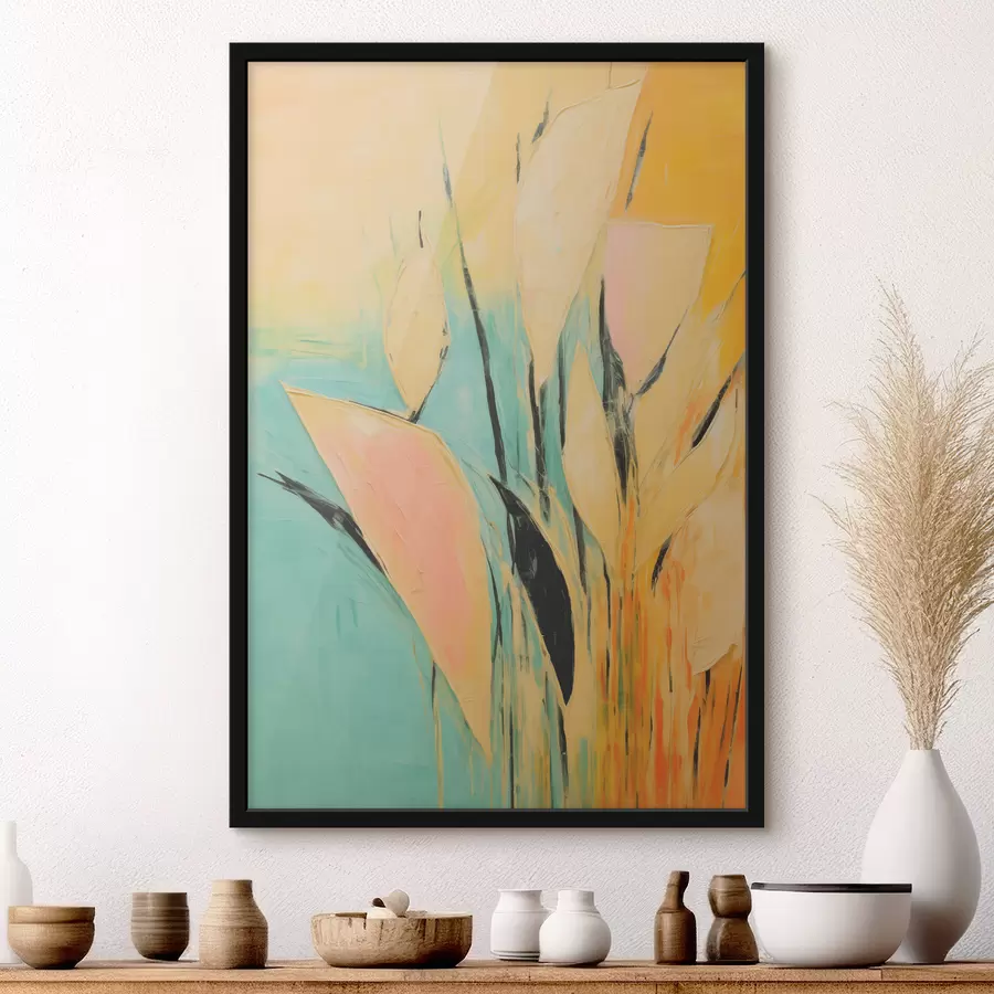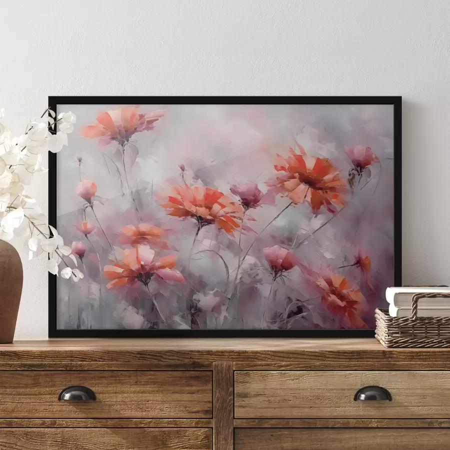 Abstrakčios gėlės, teptuko potėpių imitacija, raudona, pilka, violetinė, oranžinė spalva