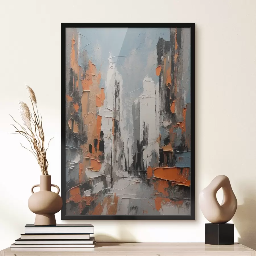 Tekstūrinis minimalistinis miesto peizažas su aukštais pastatais ir dangoraižiais, kurių siluetai išryškėja balto dangaus fone