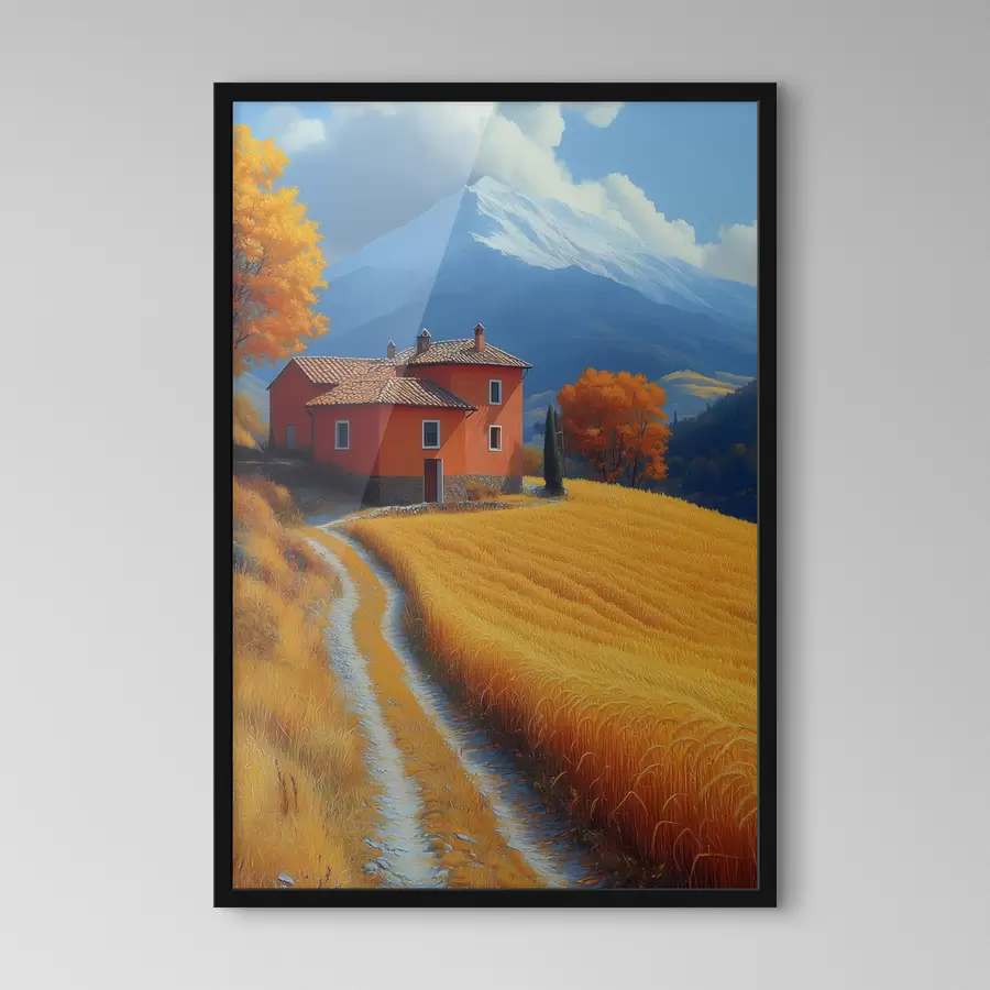 Toskanos kraštovaizdis su vintažiniais namais, pastelinėmis spalvomis, kalvomis ir medžiais, kaimiškas
