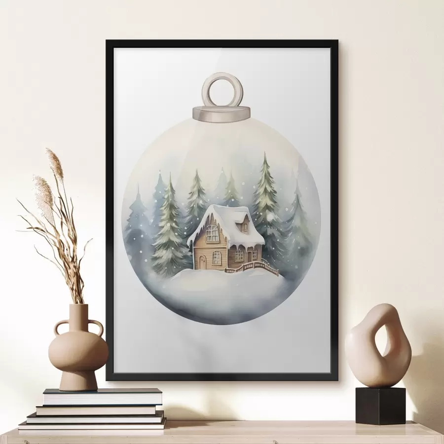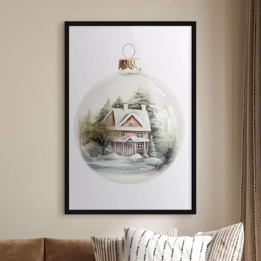 Kalėdinis dekoratyvinis rutulys su akvareliniu namu sniege, pušimis