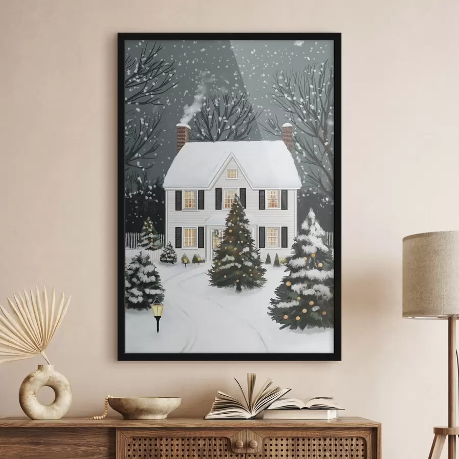 Žiemos scena su sniegu padengtu namu, mišku, pušimis