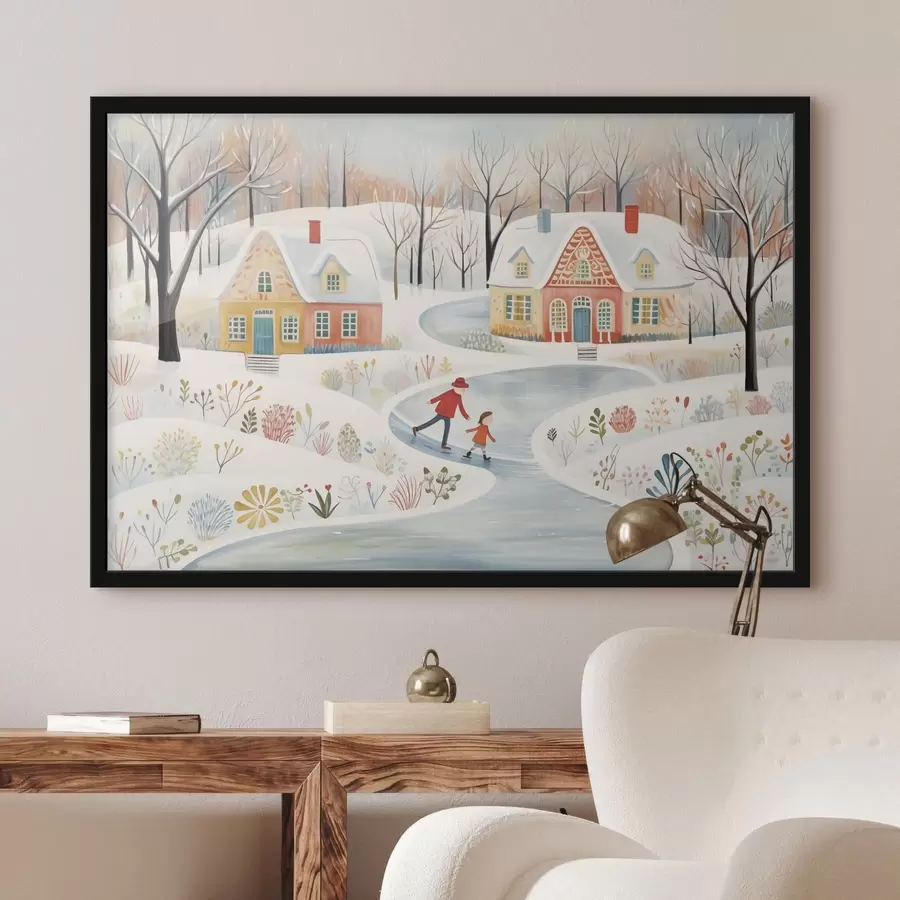 Žiemos kaimas, miškas, gėlės, čiuožimas ant ledo, spalvingi namai