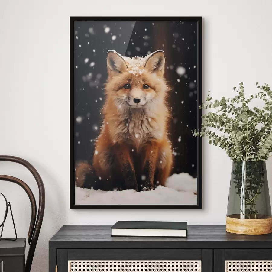 Lapė tamsiame fone tarp krentančio sniego