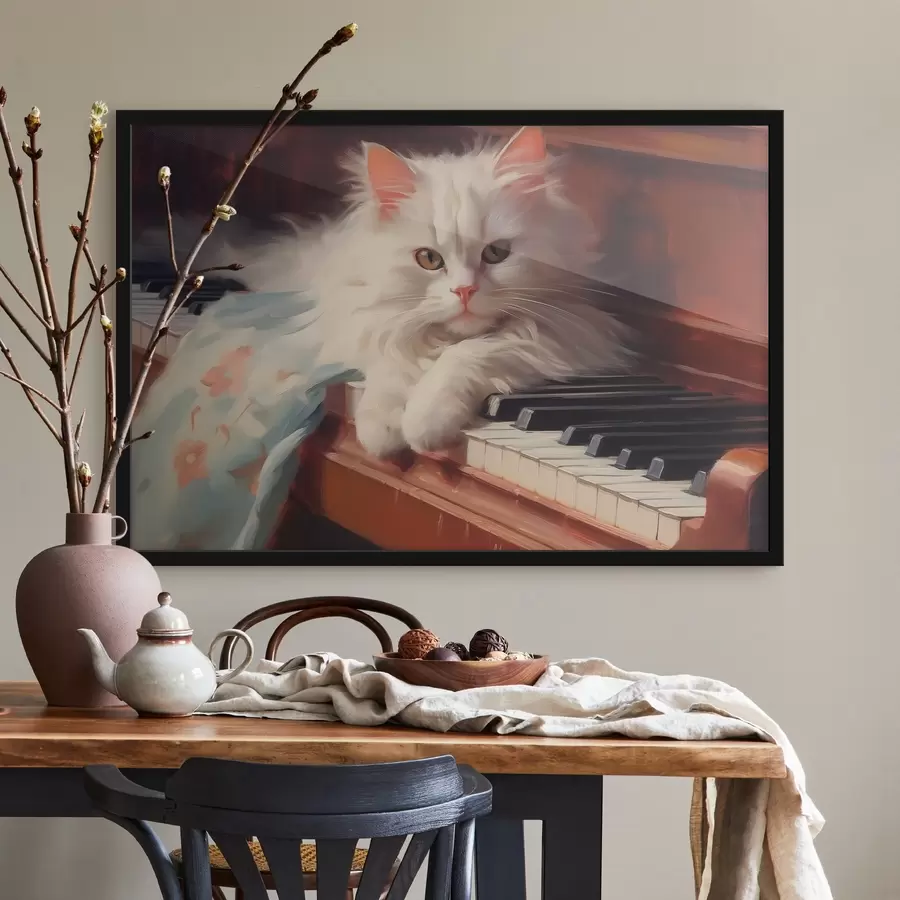 Balta katė guli ant fortepijono klavišų imitacijos tapyba