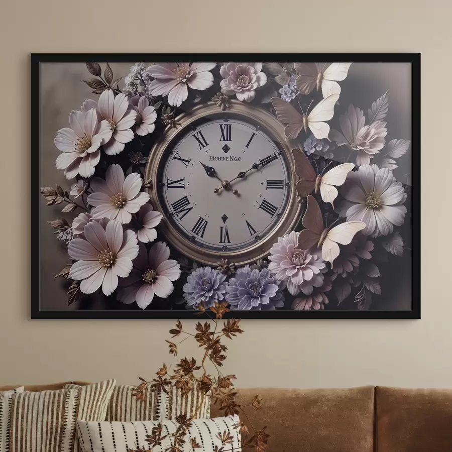 Antikvarinis laikrodis, apsuptas gražių violetinių ir rausvų gėlių tamsiame fone