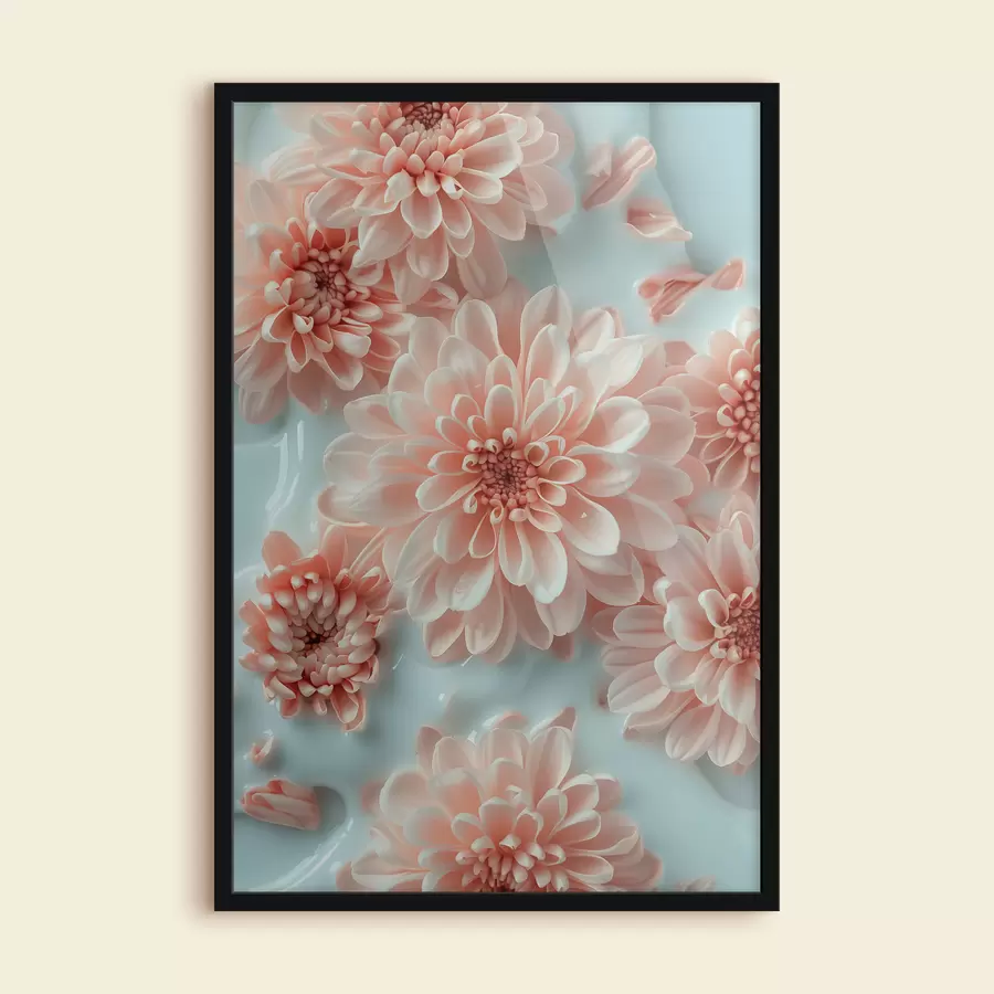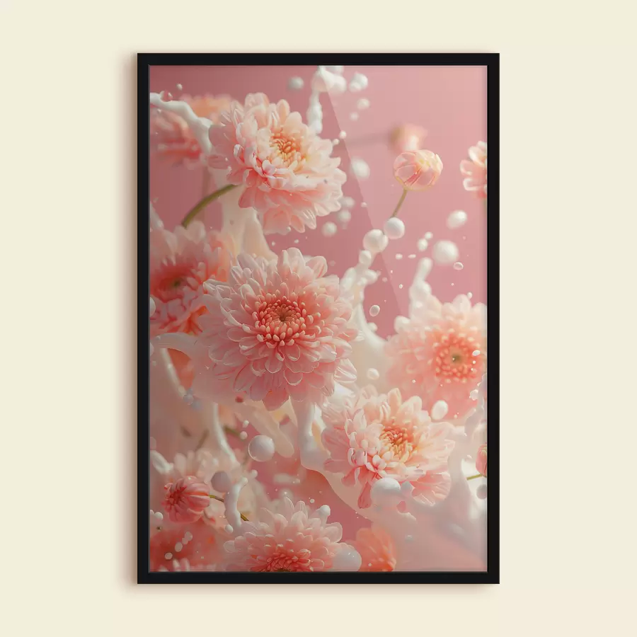 Rožinės chrizantemos su pieno purslais švelniai rausvame fone: gėlių kompozicija