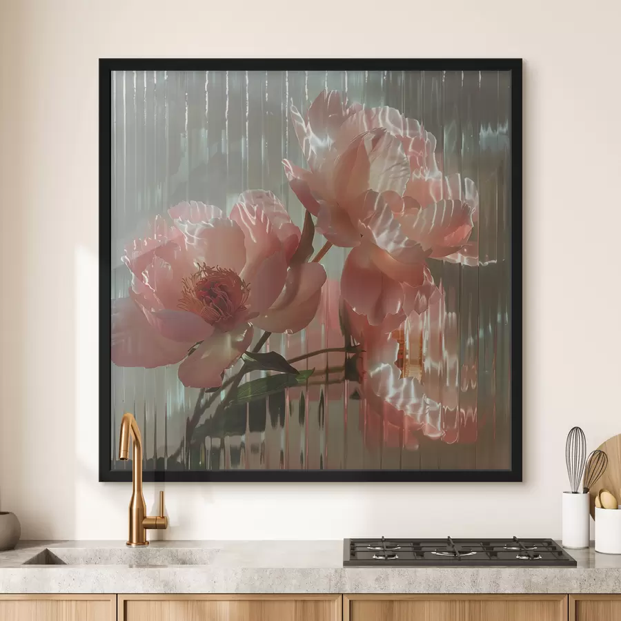 Rožiniai bijūnai matomi per gofruotą stiklą: fotorealistinis stambiu planas su šviesos iškraipymu