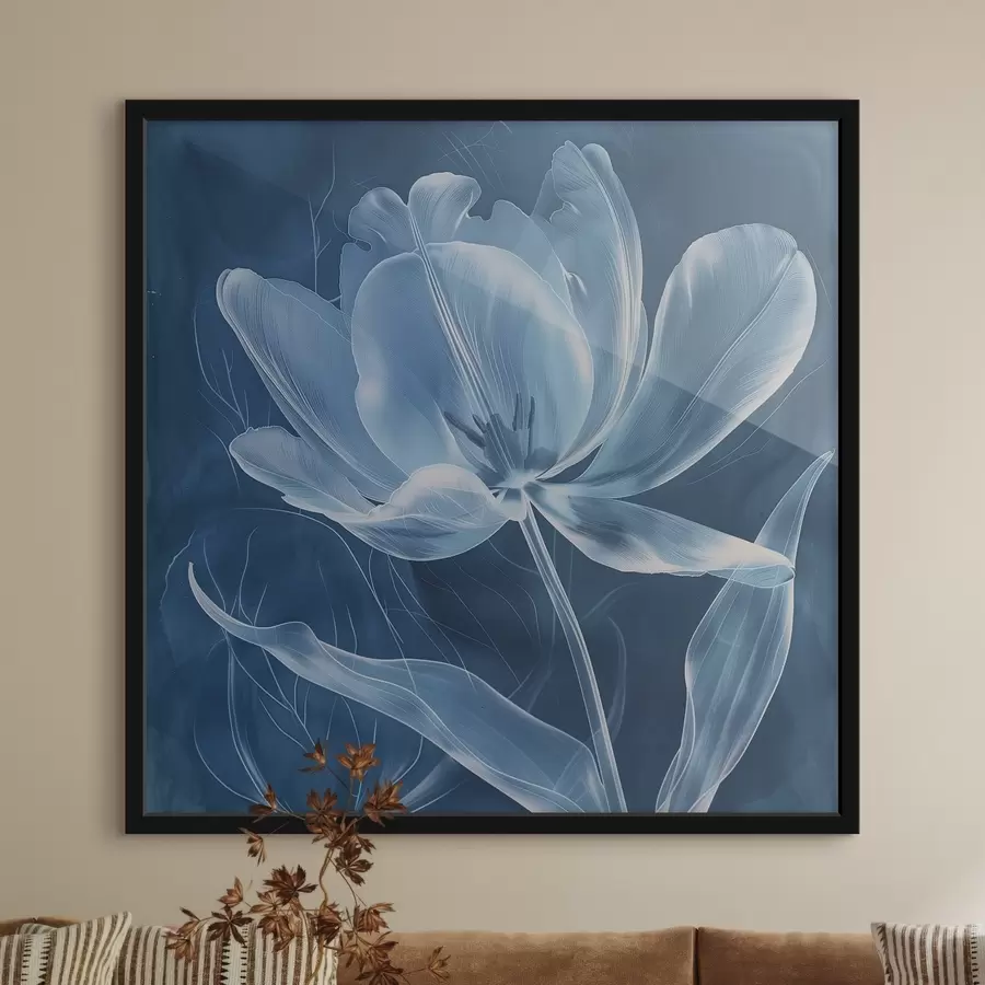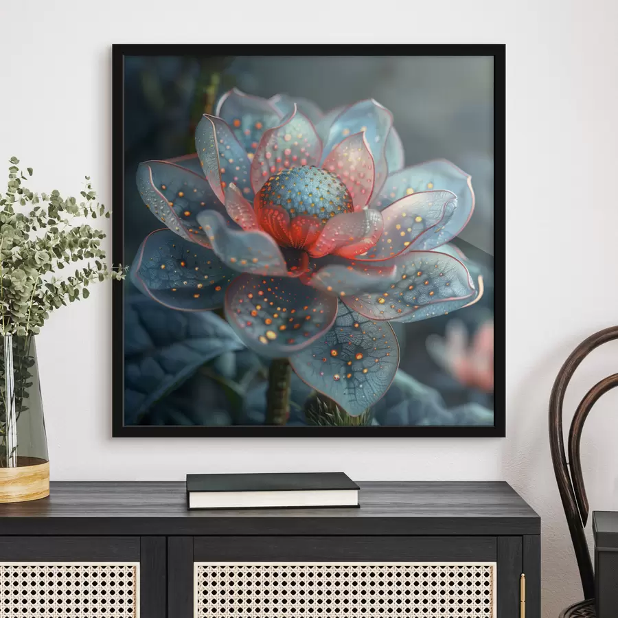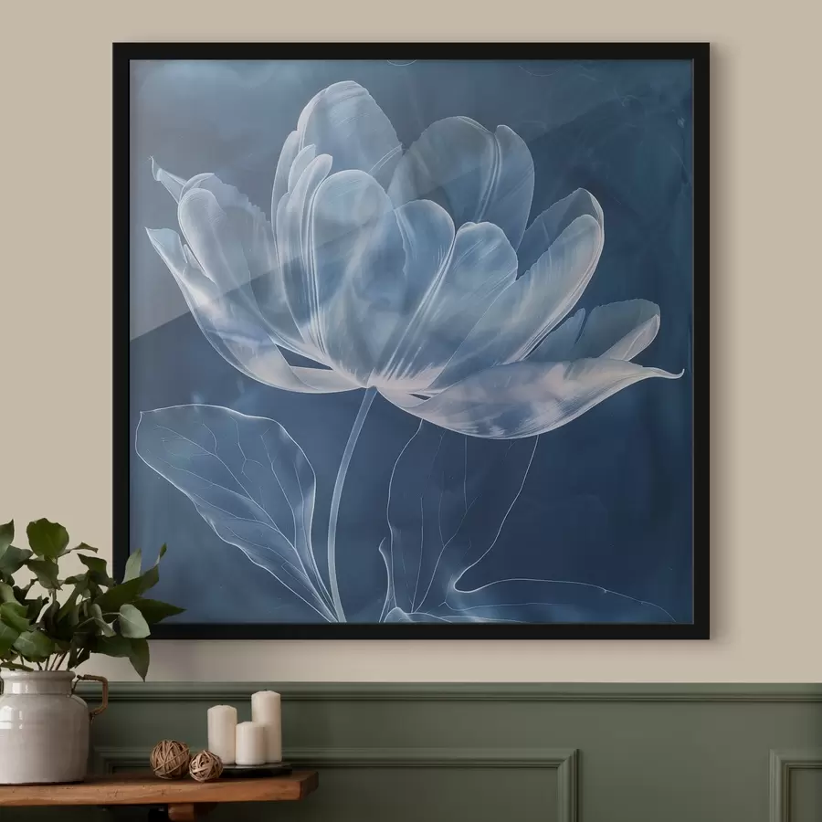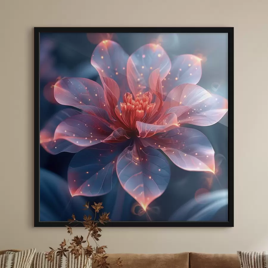Abstrakti permatoma gėlė mėlyname fone