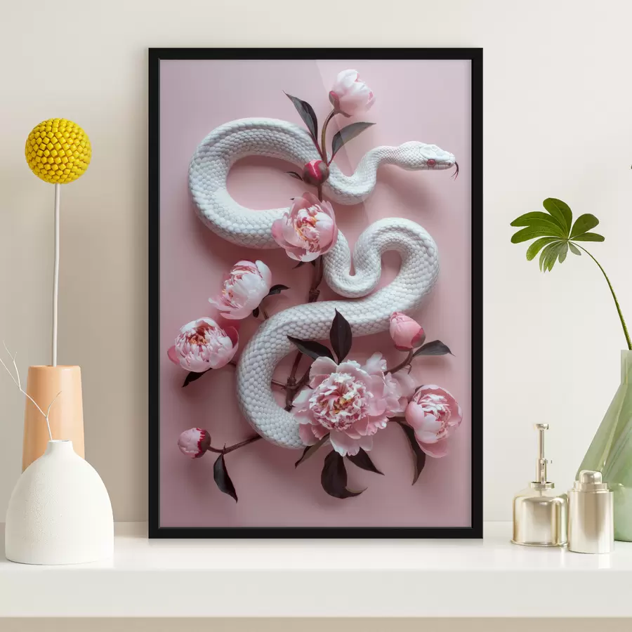 Balta gyvatė ir rožinės gėlės