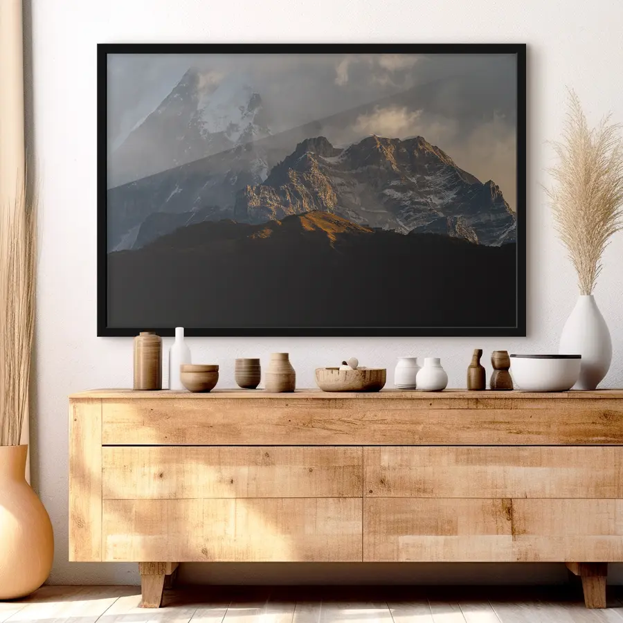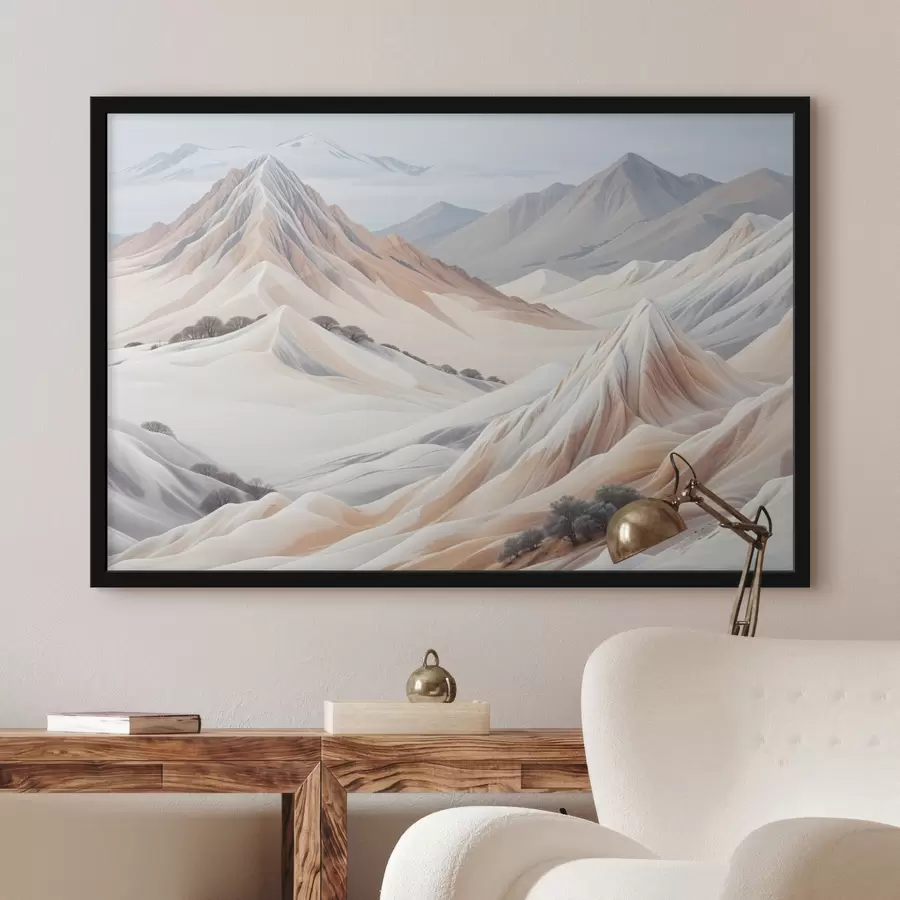 Didžiulis dykumos kraštovaizdis su slenkančiomis smėlio kopomis ir tolimais snieguotais kalnais po miglotu dangumi