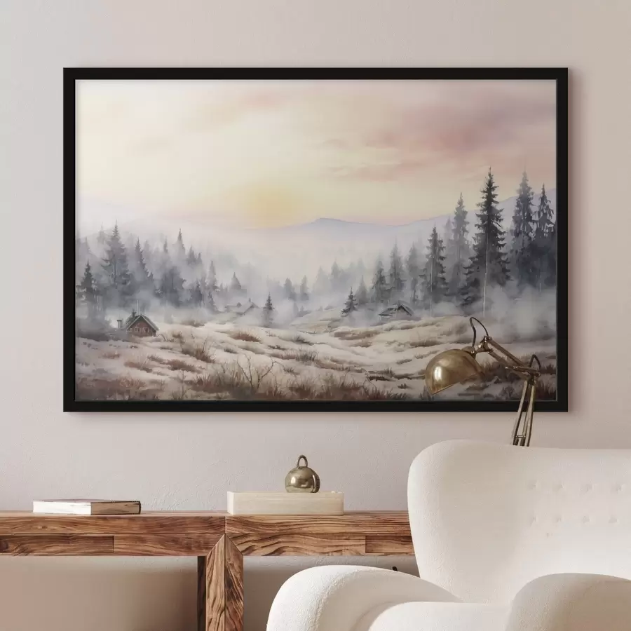 Karpatų kalnai, šalčio miškas, kaimas, mediniai namai, saulėtekis