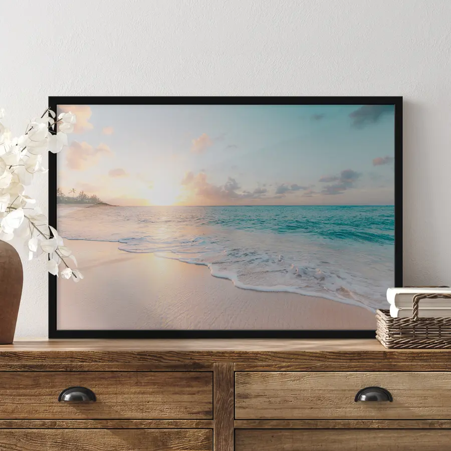 Rami paplūdimio scena saulėlydžio metu, kai smėlėtą krantą skalauja švelnios bangos